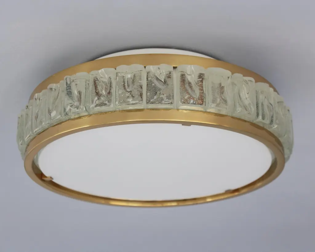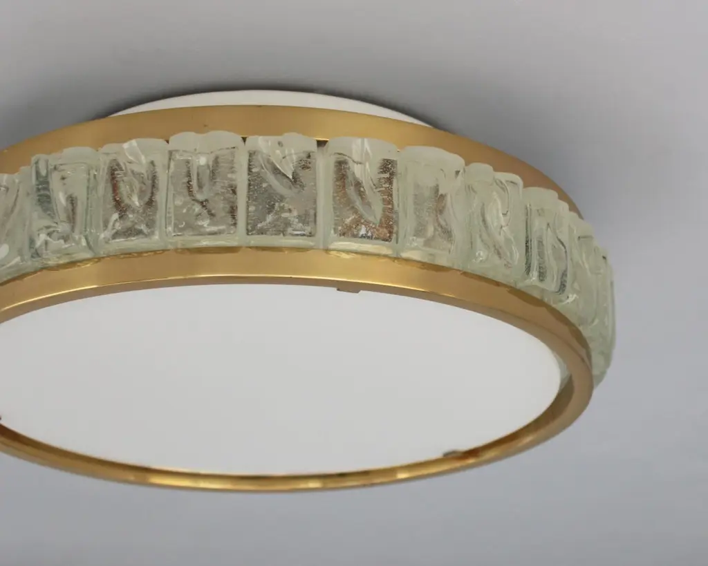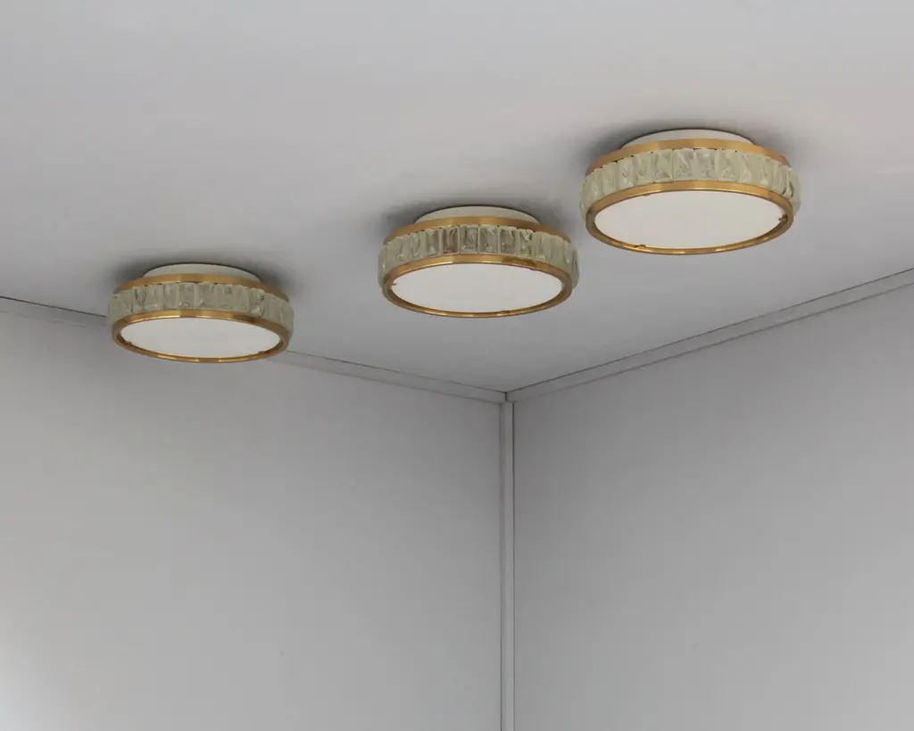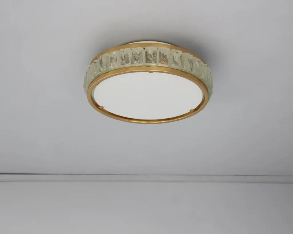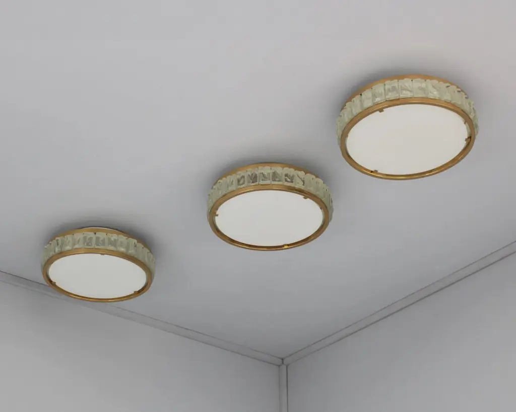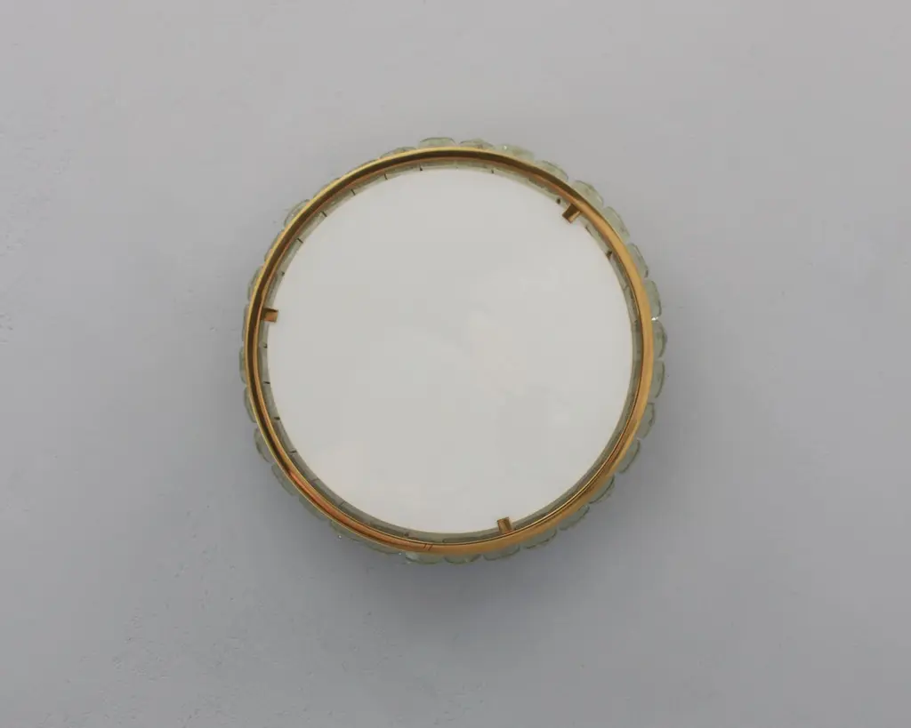 Atelier Perzel- Three fine French mid-century round “Queens Necklace” ceiling light made with rough laid glass slabs set between two brass frames and a white opaline glass diffuser (which is removable in order to replace the bulbs).Price is per fixture.
