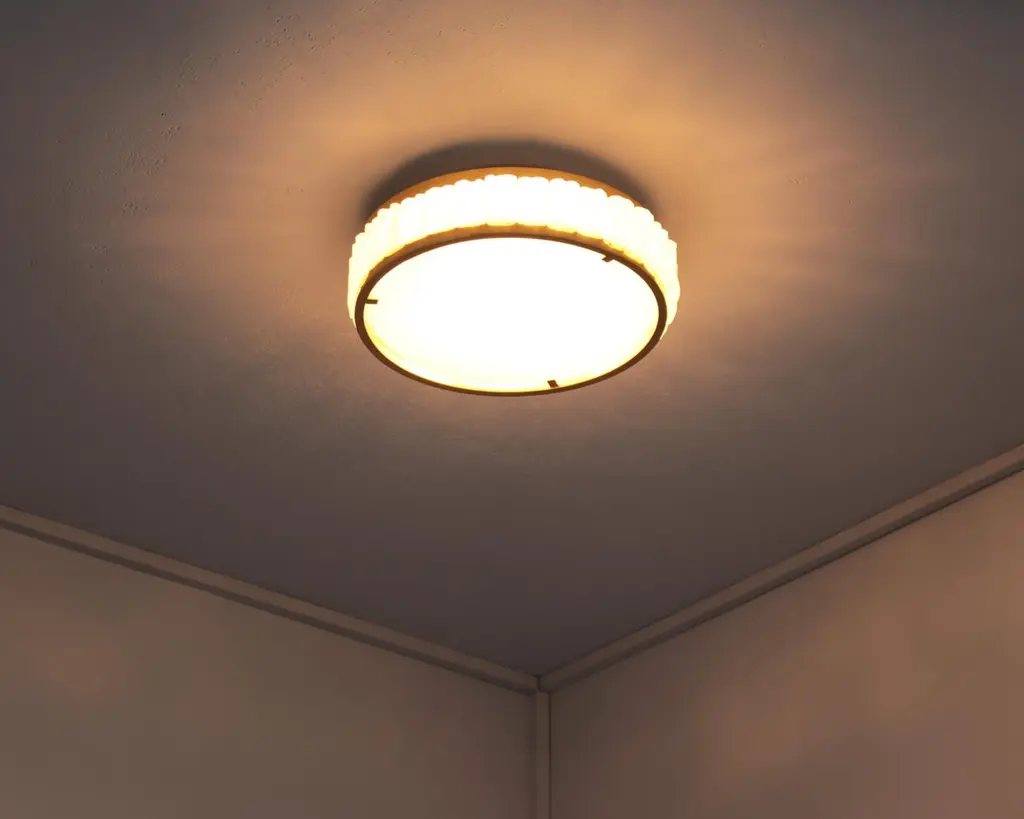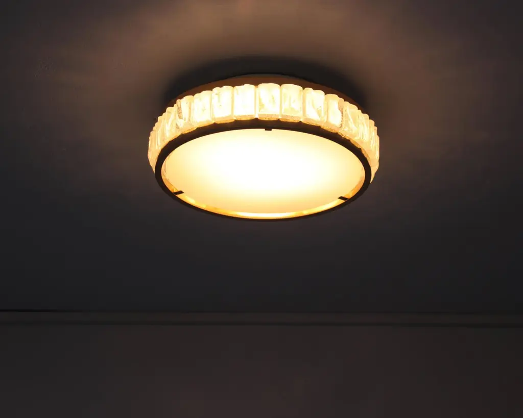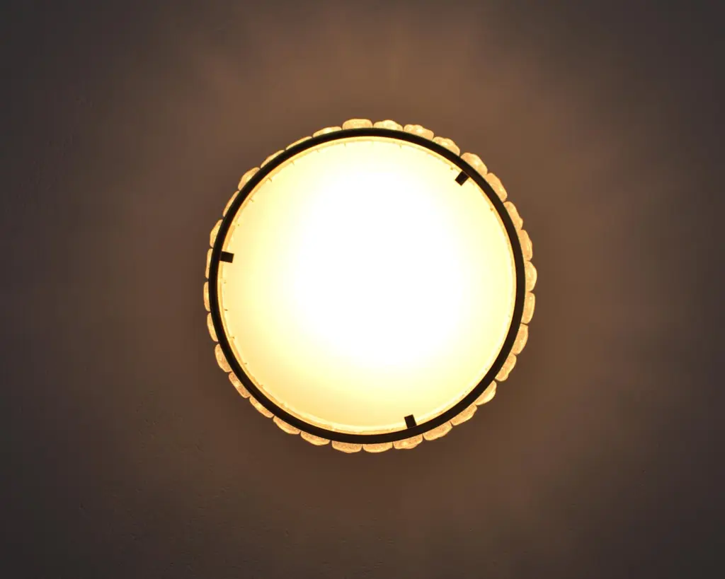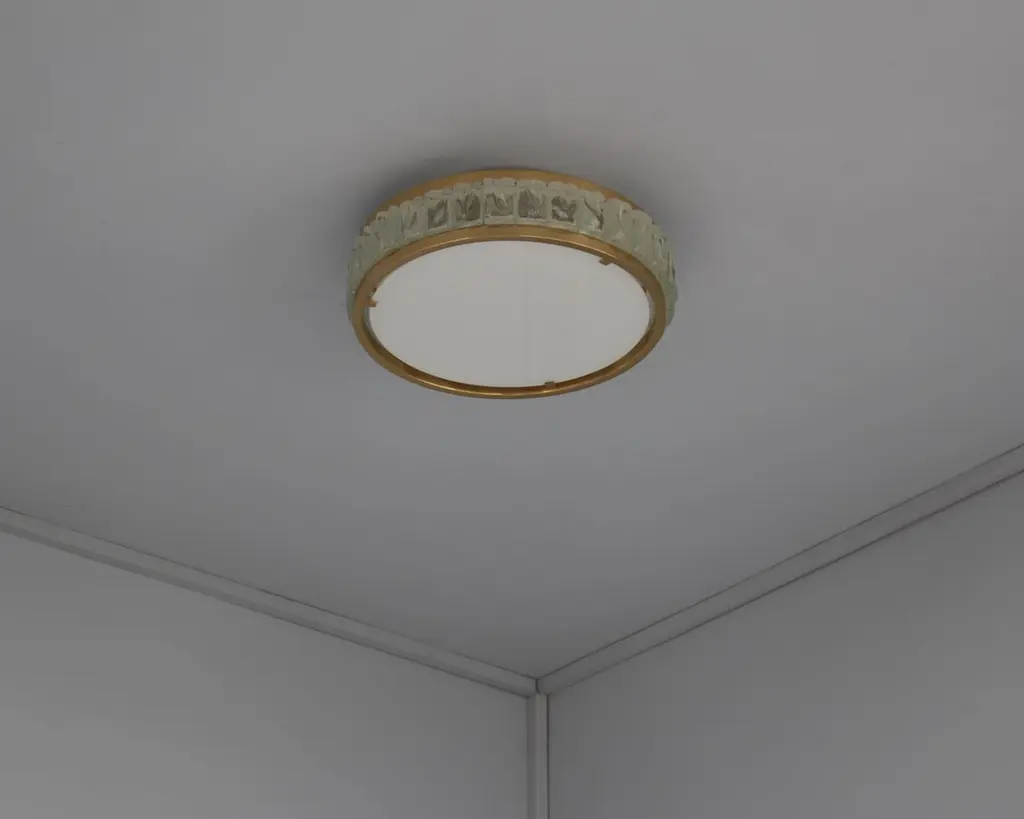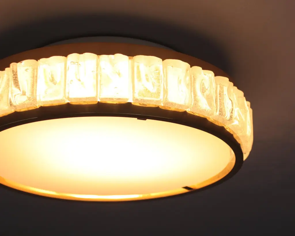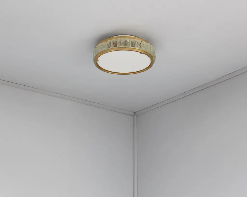 Atelier Perzel- Three fine French mid-century round “Queens Necklace” ceiling light made with rough laid glass slabs set between two brass frames and a white opaline glass diffuser (which is removable in order to replace the bulbs).Price is per fixture.