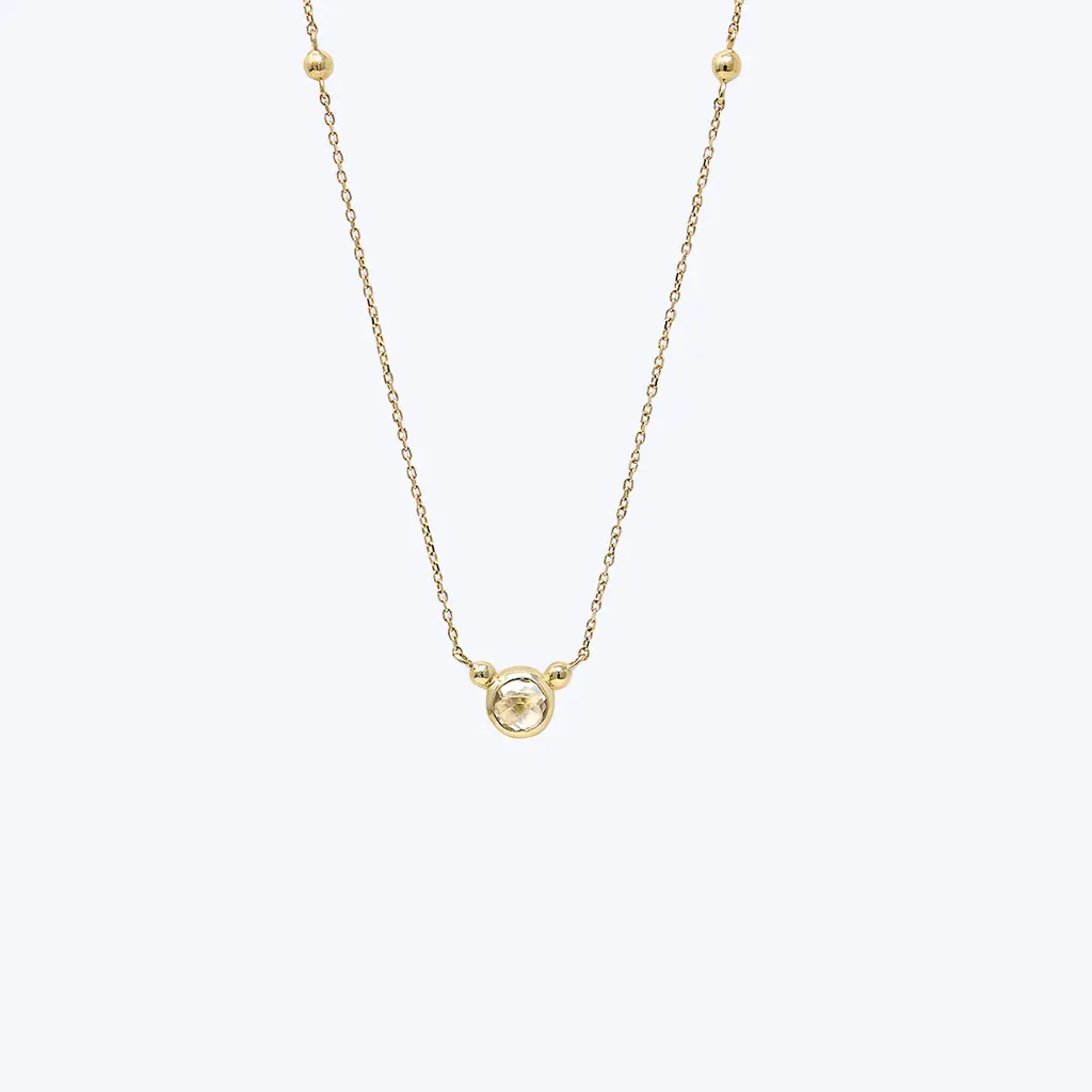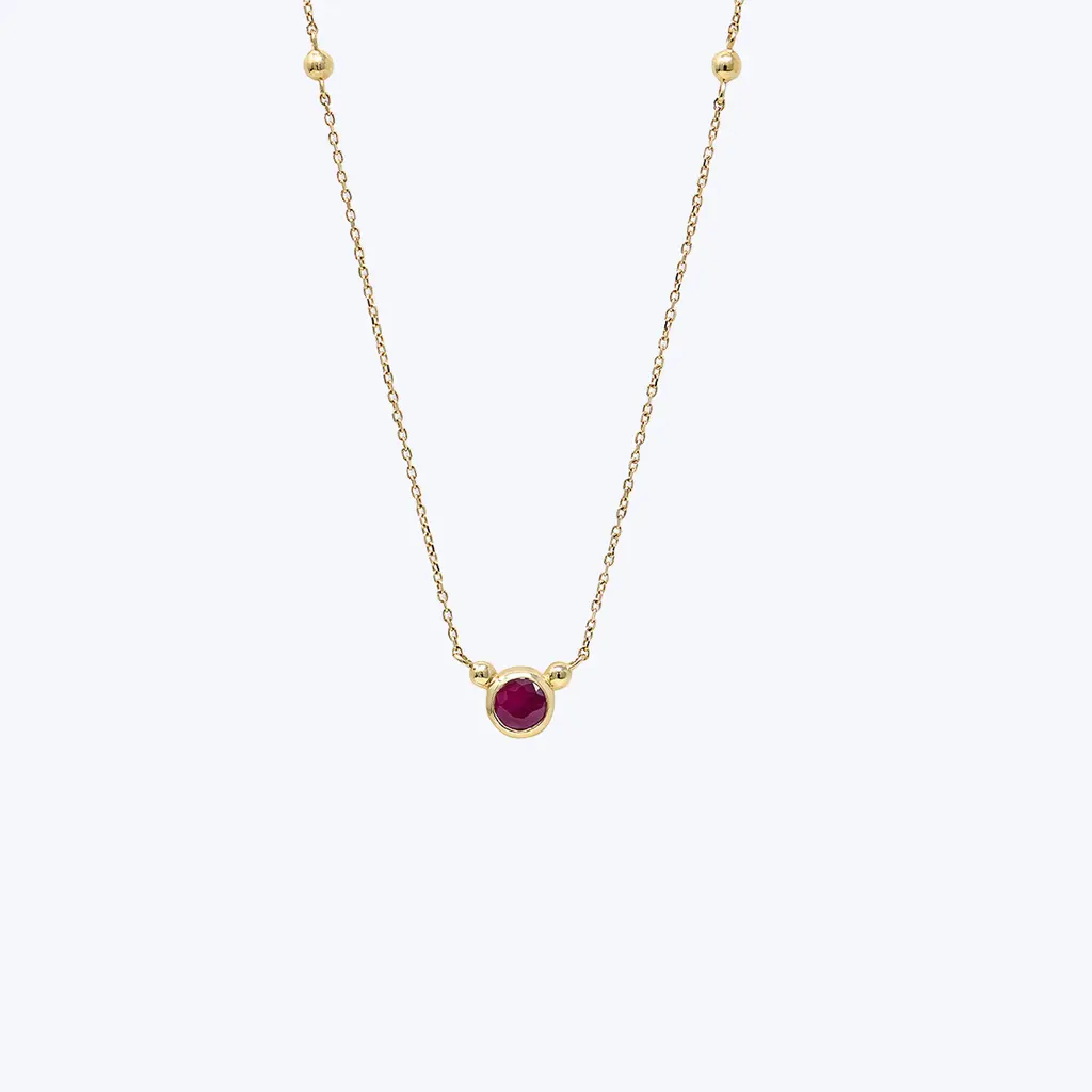 A birthstone is bezel set and suspended from a sparkling gold diamond cut chain with Dew Drop details. Stone measures 5mm in diameter and has 0.42 TCW. 16" Necklace fastens with a lobster clasp and has two 1" adjustments to make it 14" or 15”. From its inception, Anzie Jewelry has been a celebration of life and color. Named after its founder, Anzie Stein, this collection of fine jewelry is best known for its signature pieces using precious gemstones that bring luxury to your everyday wear.