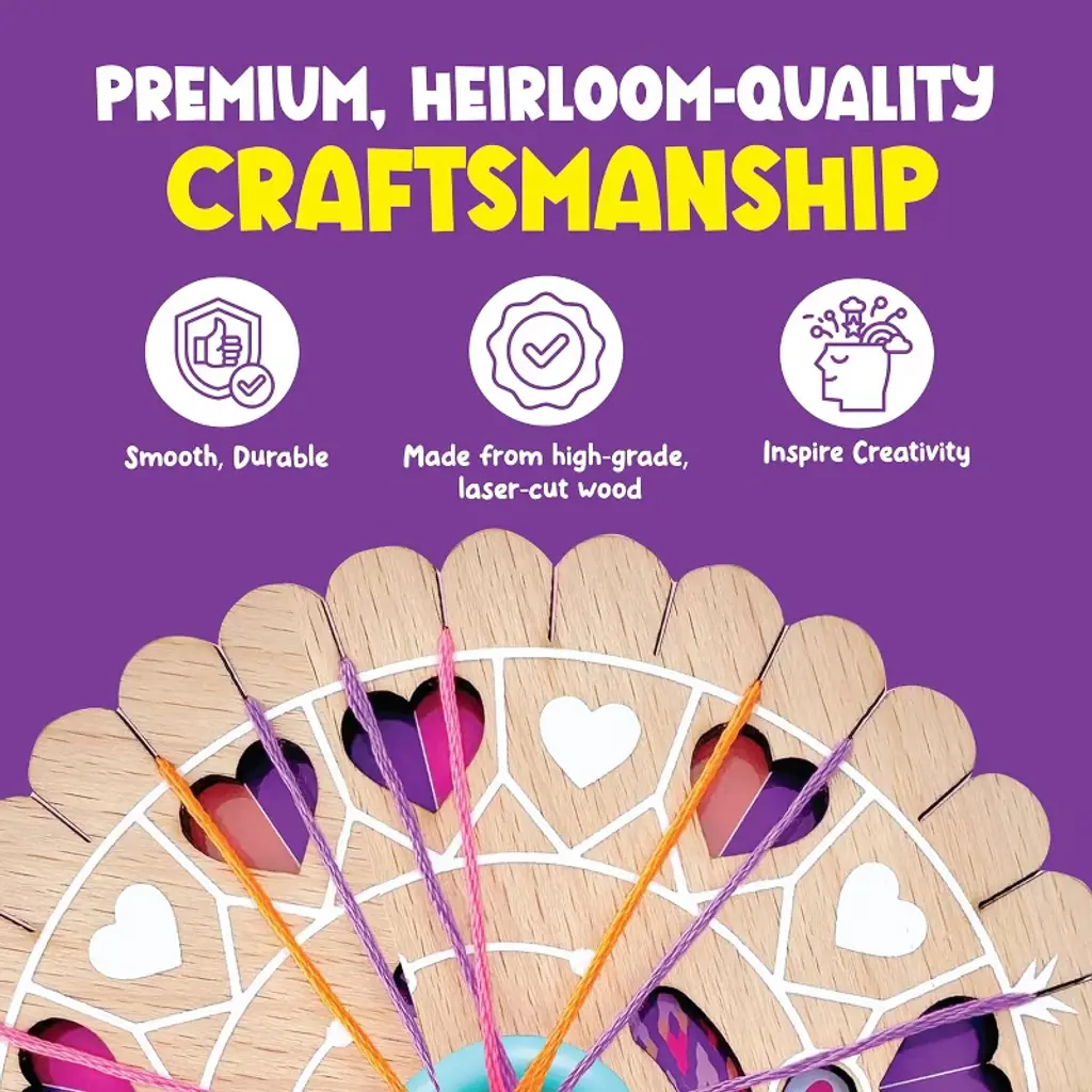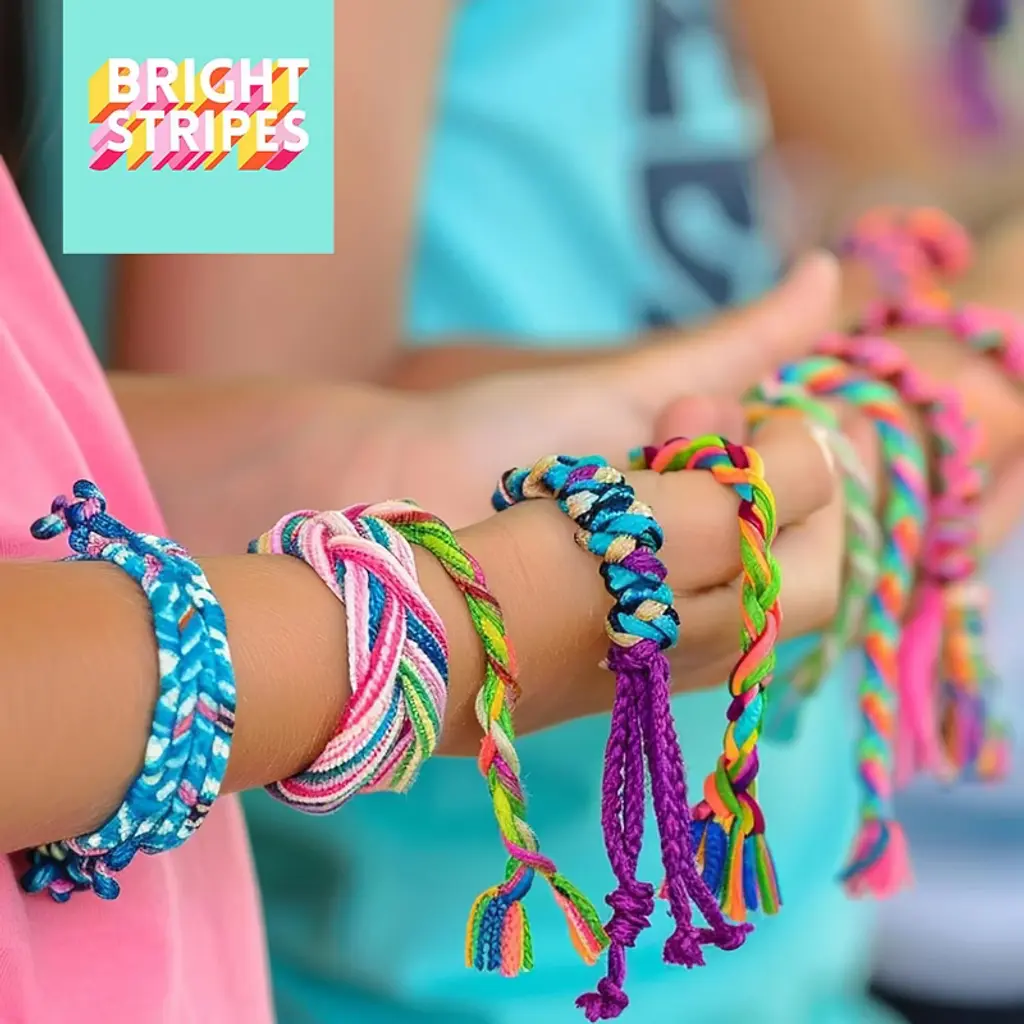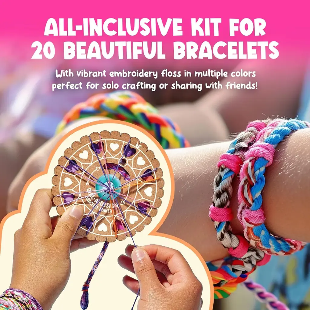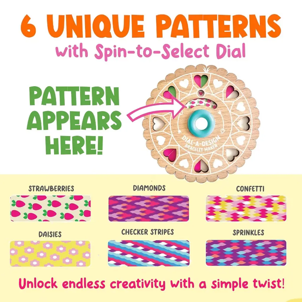 Unleash your creativity with the Bright Stripes Dial-A-Design Bracelet Maker. This innovative, patent-pending tool puts a twist on the classic friendship bracelet craft. Spin the dial to select from six unique patterns, each accompanied by easy-to-follow color guides. Crafted from high-quality, laser-cut wood, the bracelet maker offers a smooth, durable, and satisfying tactile experience. With enough vibrant embroidery floss to create up to 20 unique bracelets, this kit is perfect for solo crafting or sharing with friends. Personalize your creations with the included Craft Club gift tags, making each bracelet a meaningful gift. Ideal for ages 8 and up, this screen-free, hands-on activity is perfect for road trips, rainy days, or family gatherings.