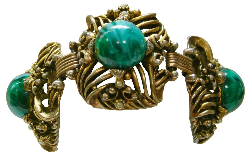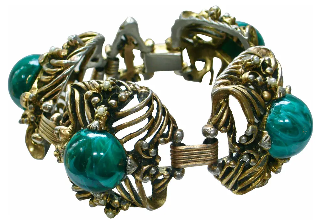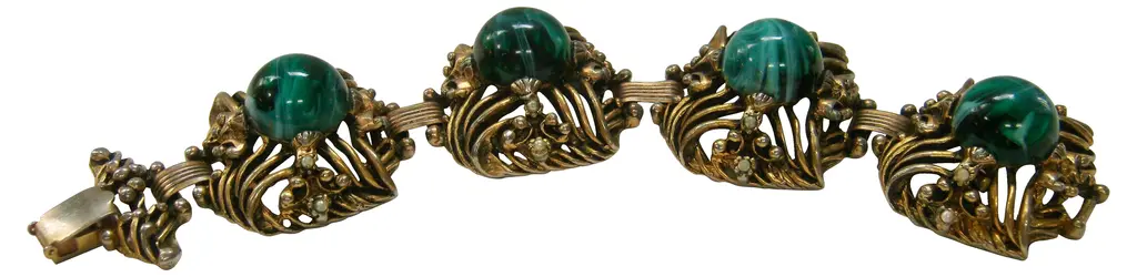 Antiqued goldtone bracelet set with domed green marbleized glass cabochons, faux-pearls, and hobnail enhancers. Fold-over clasp. No maker's mark. Age wear, patina.