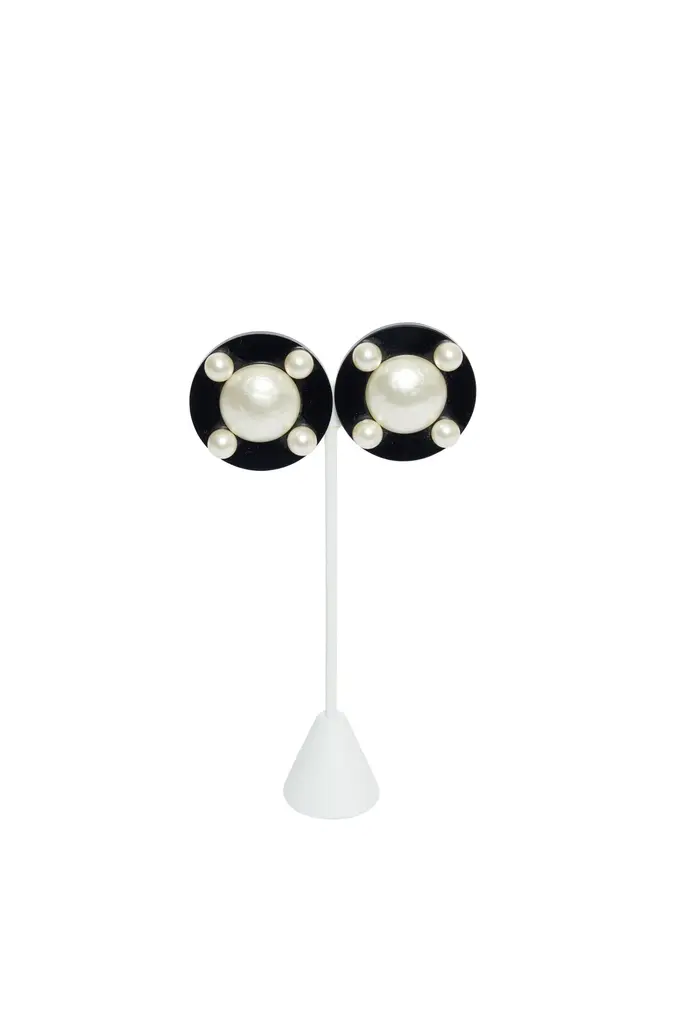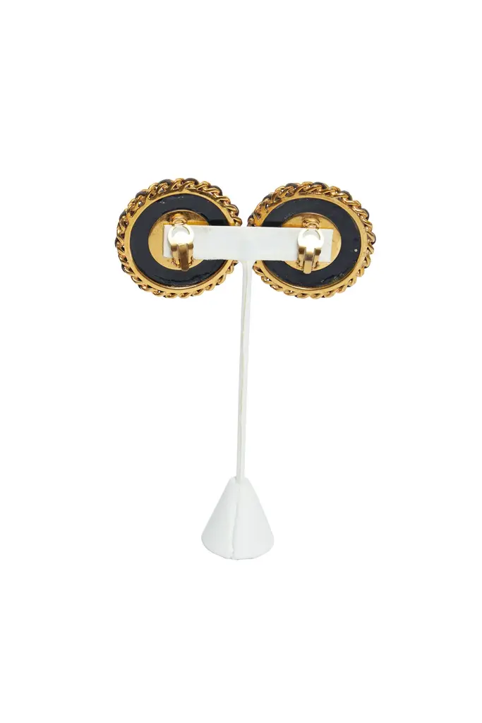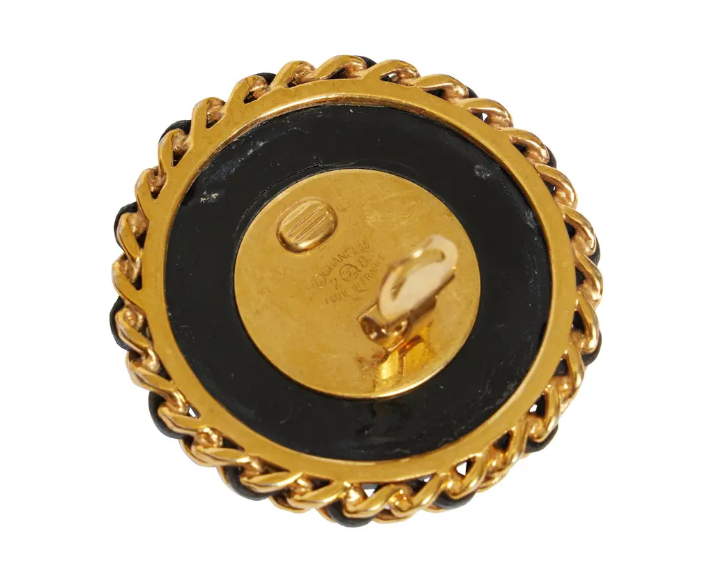 Black and white Enamel Chanel earrings with a gold and black leather chain around the trim. On the back is a small plate with Chanel written on it for authenticity. The earrings have diameter of 2'. Come with original box.