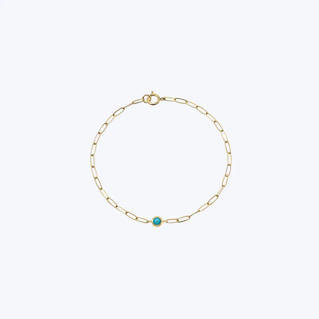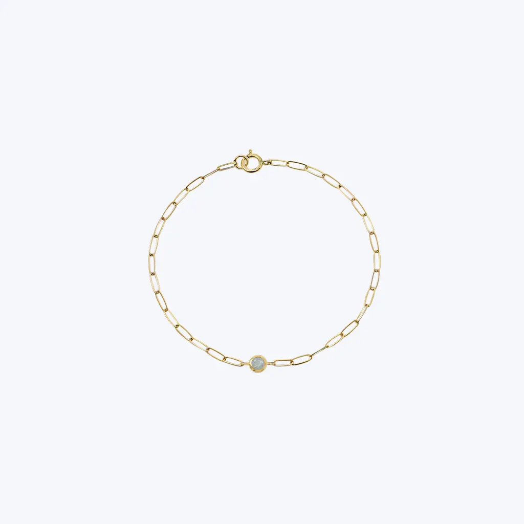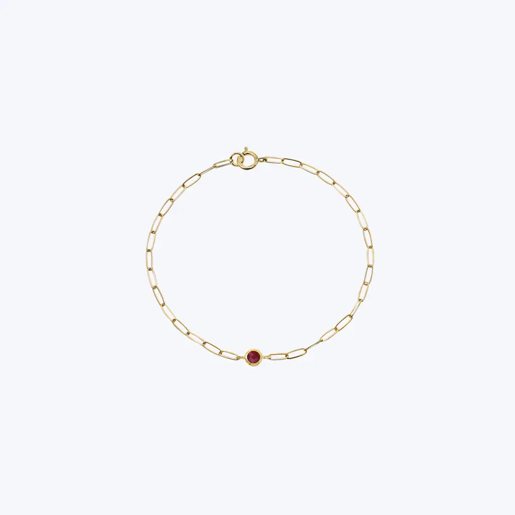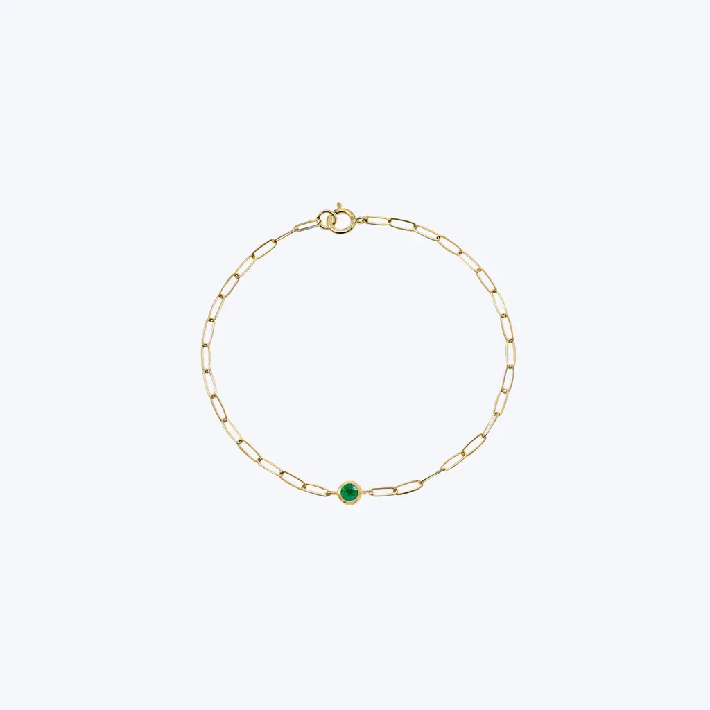 A dazzling round gemstone is bezel set in 14k gold and linked together with a paper clip chain. Gemstone measures 3mm in diameter. Paperclip chain links measure 5.25mm x 1.75mm and fastens with a trigger clasp. From its inception, Anzie Jewelry has been a celebration of life and color. Named after its founder, Anzie Stein, this collection of fine jewelry is best known for its signature pieces using precious gemstones that bring luxury to your everyday wear.
