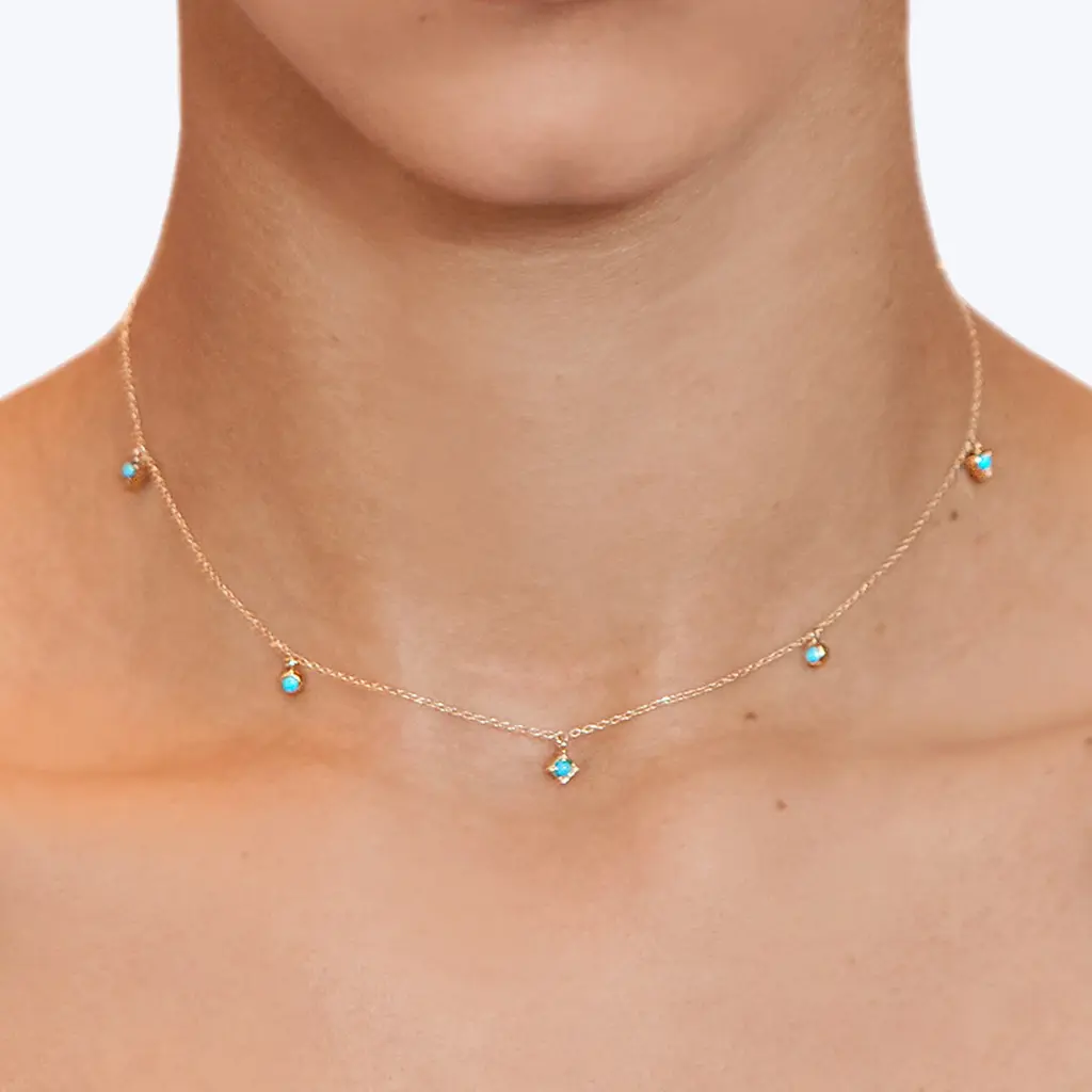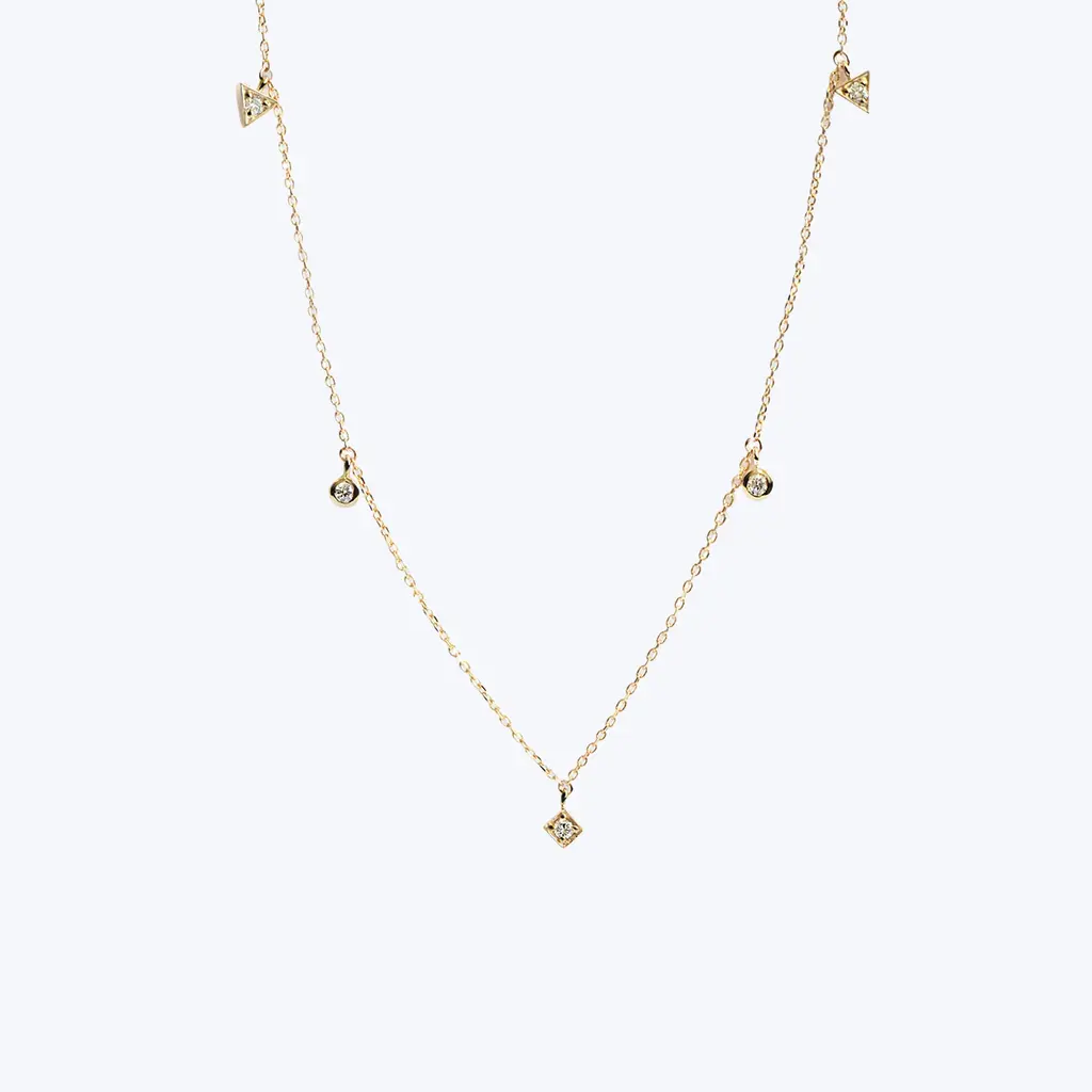 Encrusted in various geometric shapes, five gemstones dangle delicately from a gold chain. Shapes measure 3mm/ 1/8'' wide and necklace is 15", fastens with a lobster clasp & has a 28mm/ 1'' adjustment. From its inception, Anzie Jewelry has been a celebration of life and color. Named after its founder, Anzie Stein, this collection of fine jewelry is best known for its signature pieces using precious gemstones that bring luxury to your everyday wear.