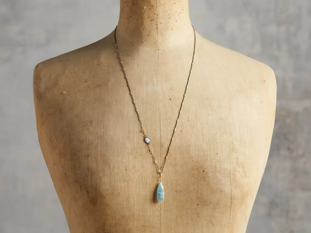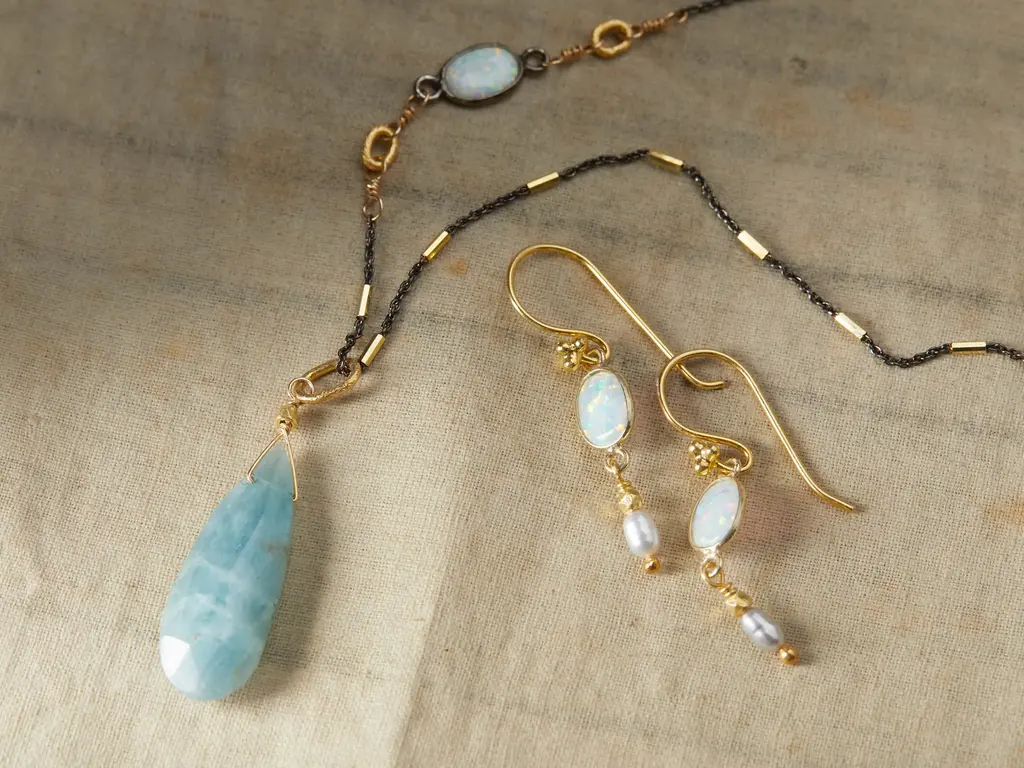 Our beautiful Devyn Necklace is crafted to channel the calming and healing properties of natural aquamarine. Offset with a magical Australian opal and accented by 22 kt gold vermeil details, this statement necklace is an exquisite addition to any wardrobe.