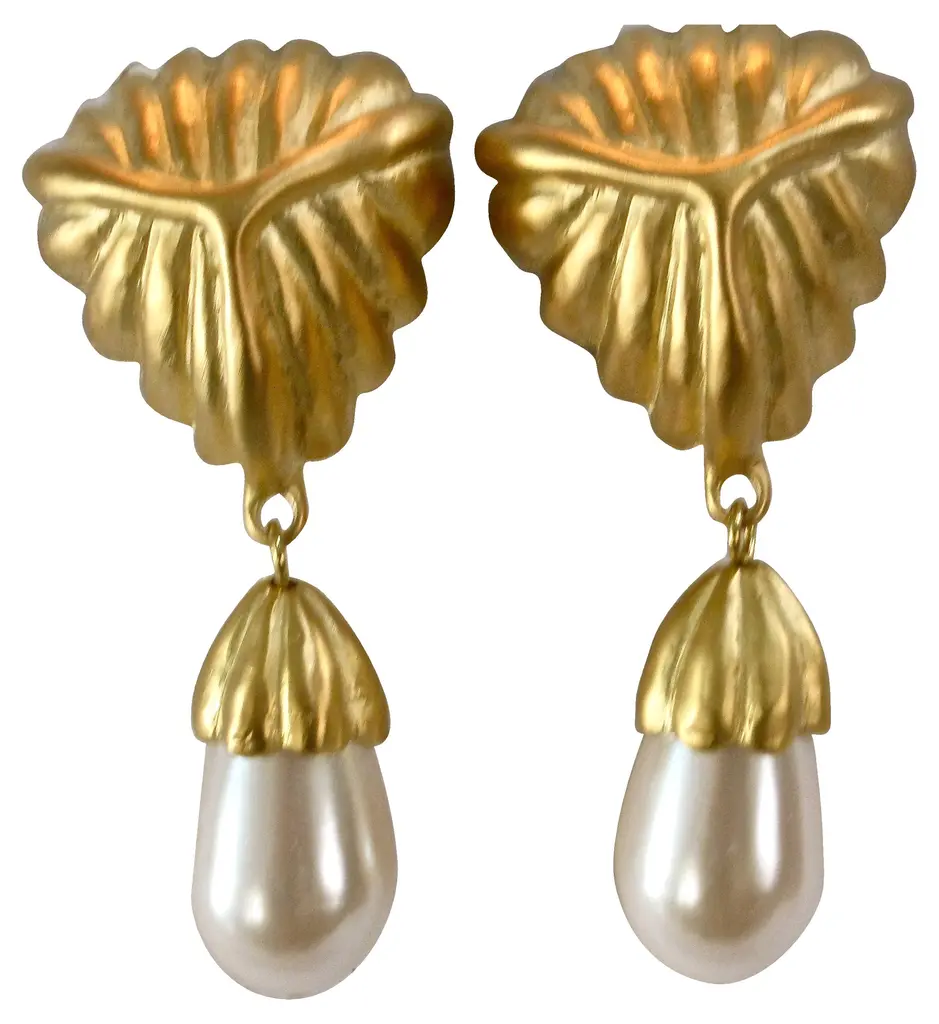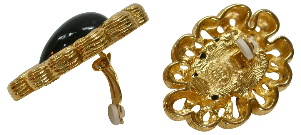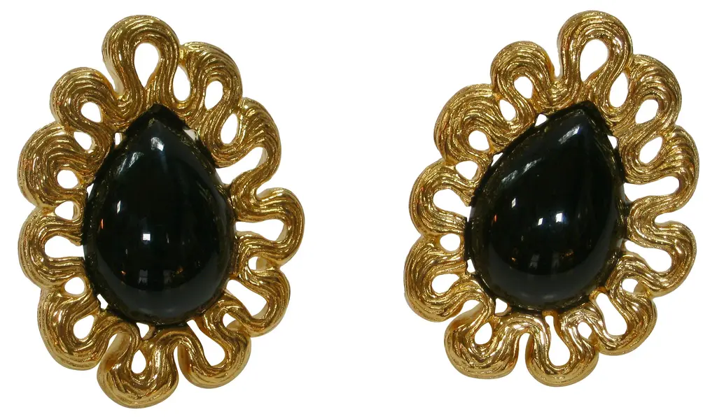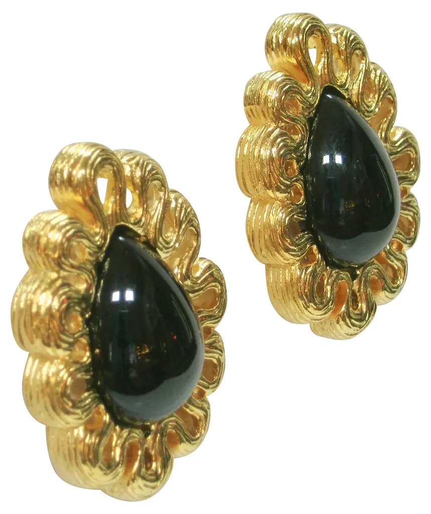 Givenchy goldtone ribbon motif clip-back earrings set with black glass stones. Signed "Givenchy, Paris, New York." From a private collection, never worn.