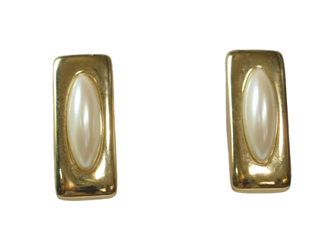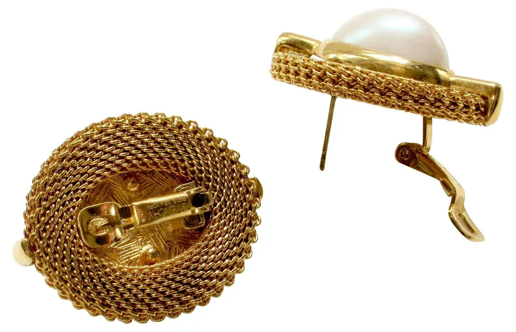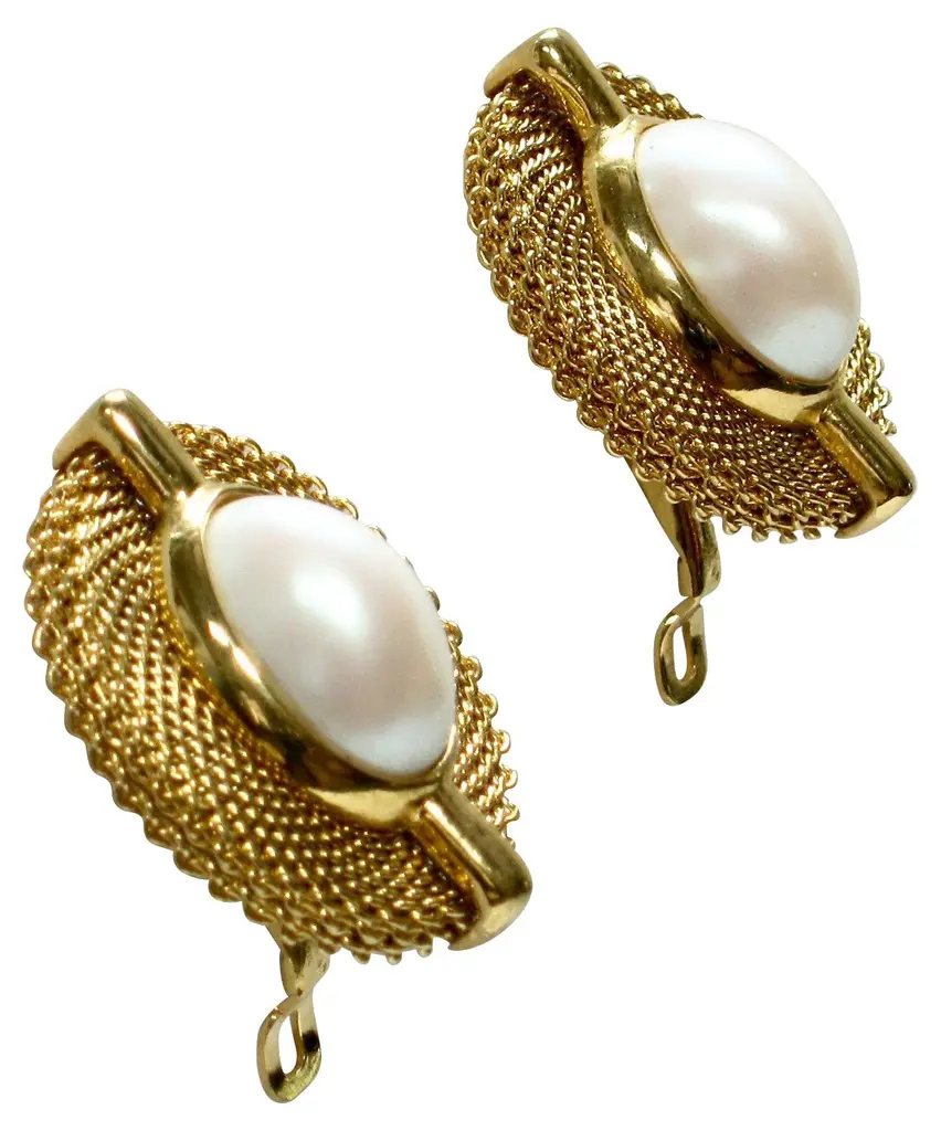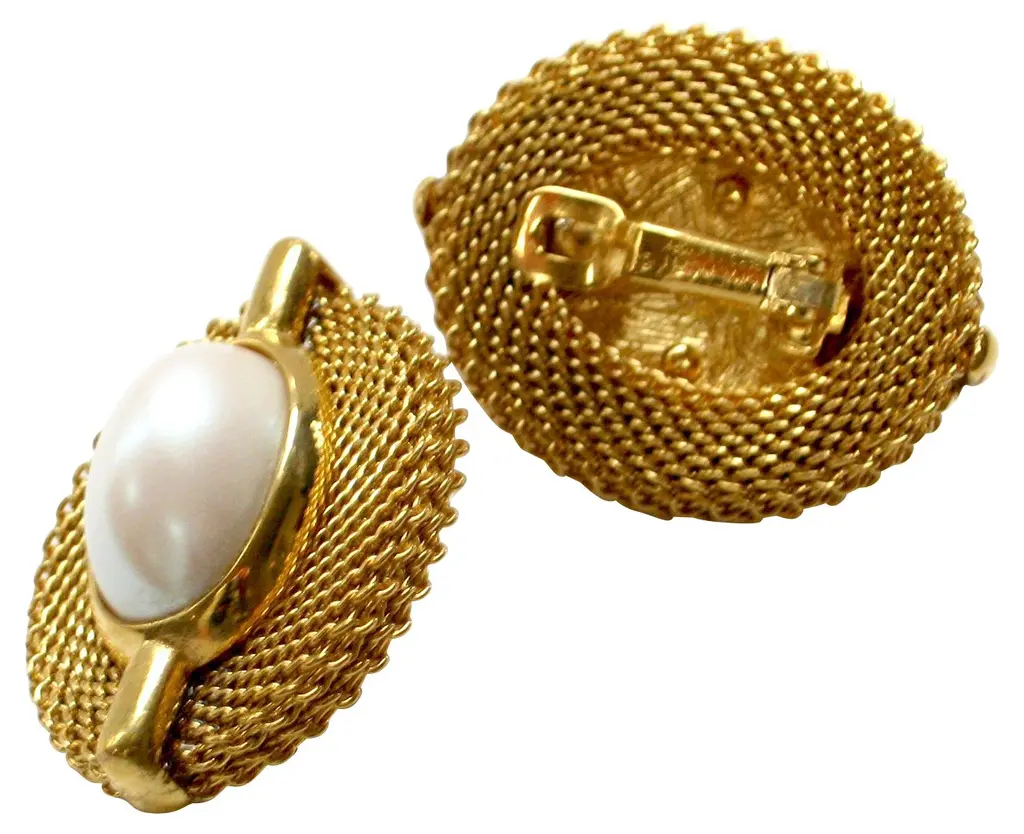 Givenchy gold-plated mesh and cabochon glass faux-pearl post-back earrings. Signed: "Givenchy, Paris, New York." From a private collection, never worn.
