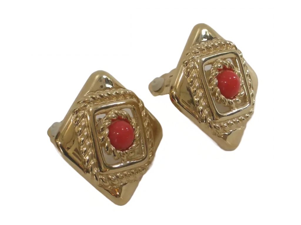 1980s gold plate carved open work coral glass cabochon clip back earrings. Signed,'Givenchy, Paris,New York" From my private collection, never worn.