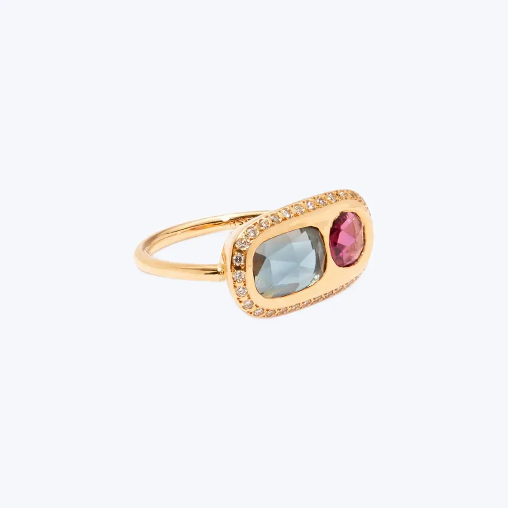 Featuring a pillowy antique cushion cut London Blue Topaz alongside a rose cut oval Rhodolite Garnet set in 14k Yellow Gold. A halo of brilliant cut white Diamonds adds extra sparkle and brightness! Scosha Jewelry is a colorful, creative combustion of art meets artifact with a signature style that blends the raw with the refined. These luxurious eclectic jewelry pieces are made to be worn casually every day.
