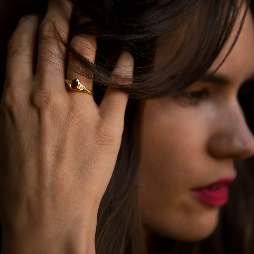 The Julienne ring is made in solid 14k yellow gold. The center stone is a pear shaped Ruby, approximately 6x4mm, 0.5ct. The two pear diamonds are 3x2mm and 0.13ct, quality is AAA Ruby/Diamond G-H color and VS2-SI1.