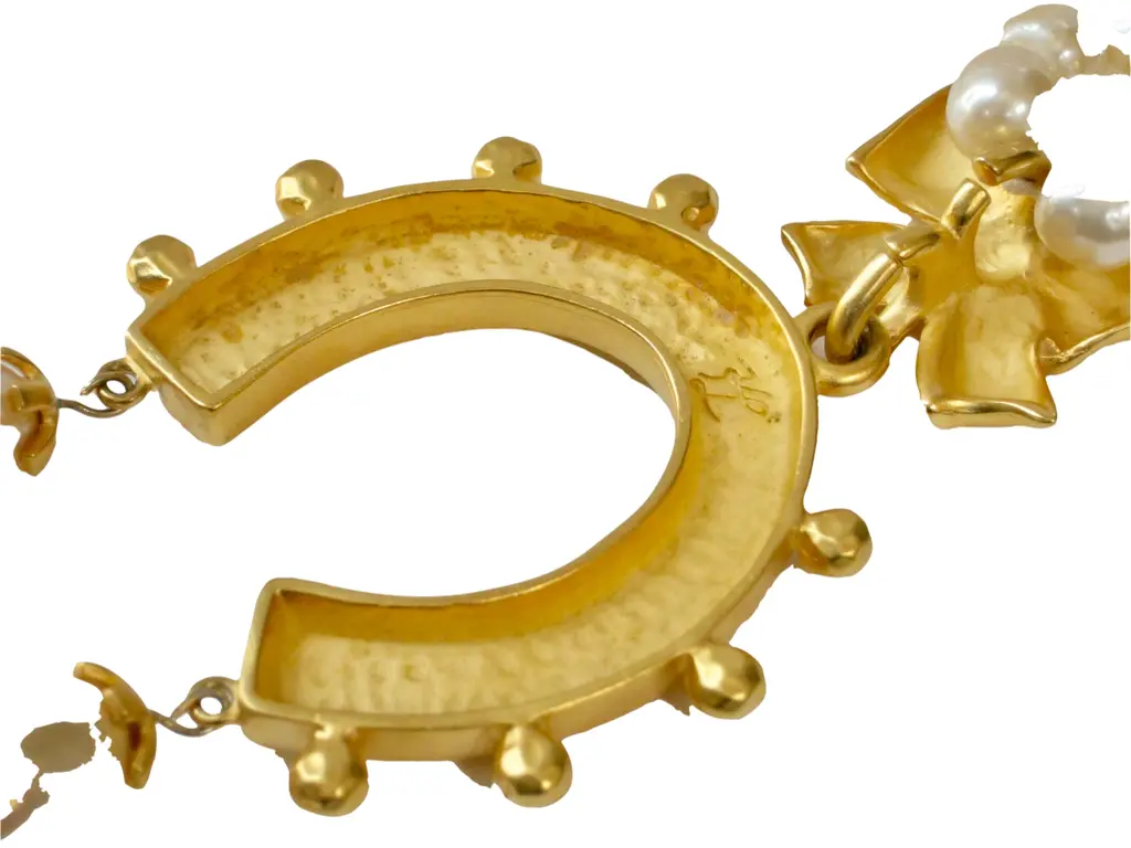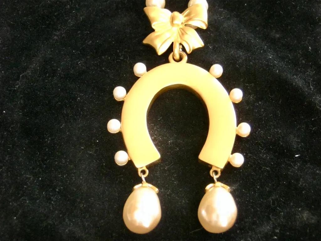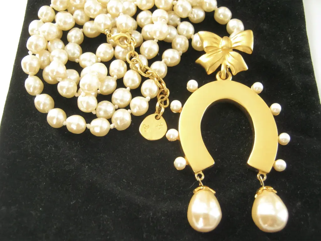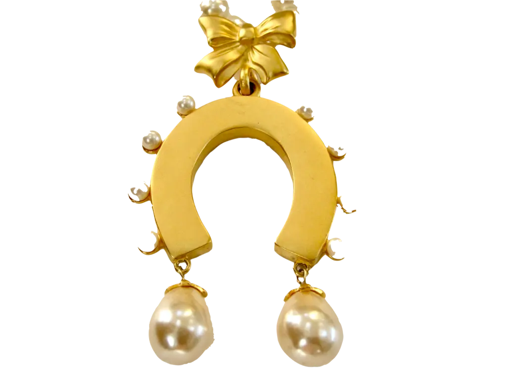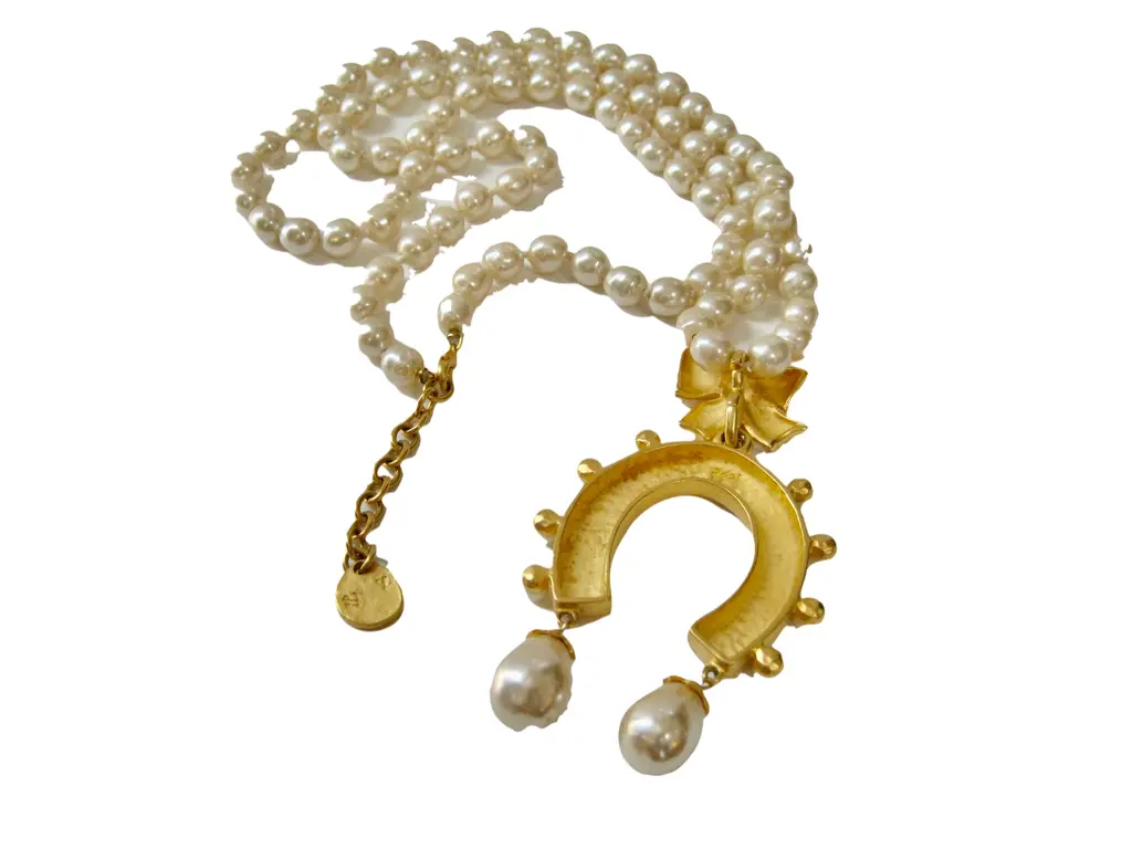 Karl Lagerfeld rare stunning runway horseshoe accented with glass pearls matte gold bow lobster claw clasp hand knotted pearl necklace Signed "KL' in script . From a private collection, never worn. Drops, 24".25 L Adjustable 2.5 additional inches.. 40,5"L