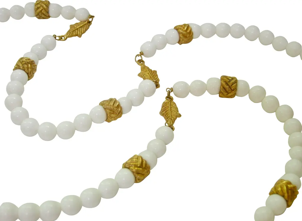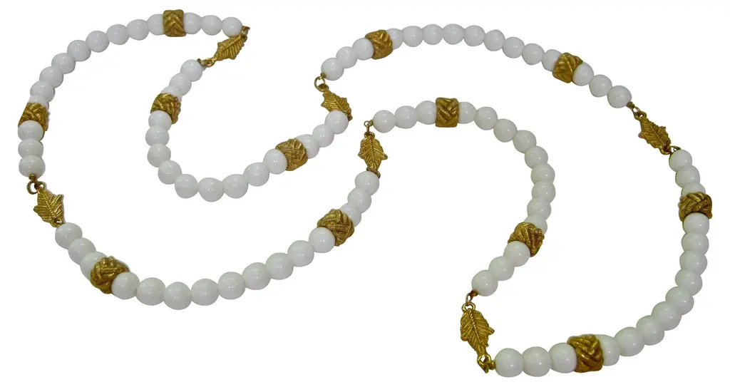 Vintage milk glass and carved goldtone metal leaf-motif beaded necklace. No clasp. From a private collection, never worn. Attributed to Givenchy. Unsigned.