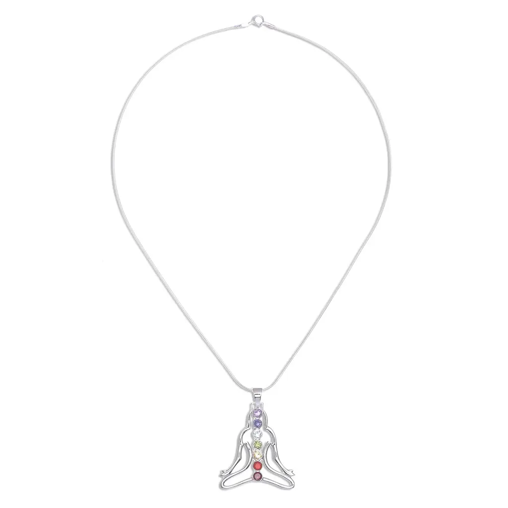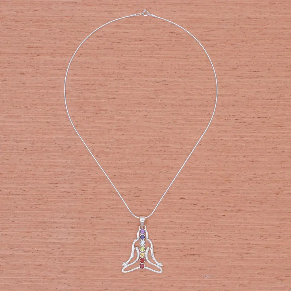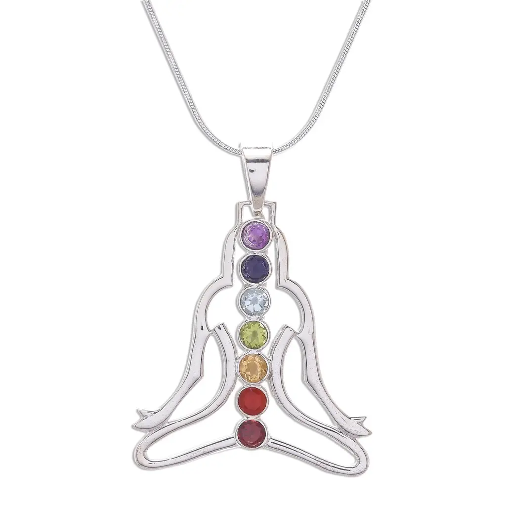 Inspire that special person in your life with a present that brings serenity and relaxation. The NOVICA team picks fabulous items crafted in Thailand for a unique gift set designed to boost tranquility and peacefulness. Gleaming sterling silver outlines a person seated in meditation pose in an awe-inspiring pendant necklace with amethyst, iolite, blue topaz, peridot, citrine, carnelian and garnet gemstones, representing the seven chakras. Soothe your senses with the sweet aroma of a tealight beautifully set on top of a celadon ceramic elephant candle holder, boasting hand-painted accents and a soft green crackled glaze. And arrive at the yoga studio in style using a handy and stunning cotton mat bag showcasing a gorgeous Thai floral print, a dark brown cotton lining, an interior zippered pocket, brass fixtures and a convenient adjustable strap.