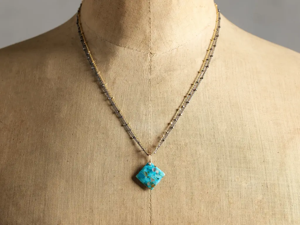 Featuring a vibrant cushion-cut turquoise pendant, Rhea is an eye-catching necklace accented by a trio of satellite chains with 14 kt gold vermeil details for extra shimmer. Handcrafted by LuLu Designs in Mill Valley, California, our exclusively curated jewelry collection showcases unique designs that combine organic textures and traditional elements, celebrating the natural beauty of hand-worked metals and stones.