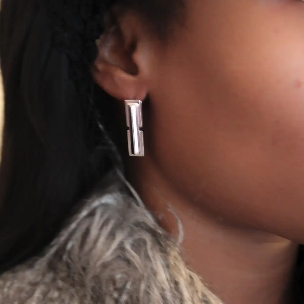 The Silver Statement Earrings Two Storey showcase the beauty of contemporary African design. These silver bar earrings are multi-faceted with a design that is inspired by architectural form. The Silver Statement Earrings capture and reflect the light when worn. Accessorize outfits with these bold silver bar earrings. The pair of earrings is a memorable gift choice for celebrating special occassions. Made for pierced ears.