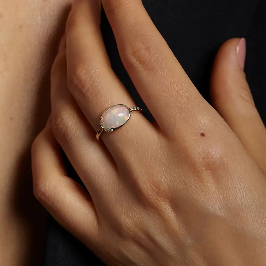 Meet the Alice Opal Ring! Cast from solid yellow gold, this opal signet ring features a genuine cabochon Australian opal that is believed to shield against negativity and burn off karma. White diamonds along the band add extra sparkle and dimension. Scosha Jewelry is a colorful, creative combustion of art meets artifact with a signature style that blends the raw with the refined. These luxurious eclectic jewelry pieces are made to be worn casually every day.