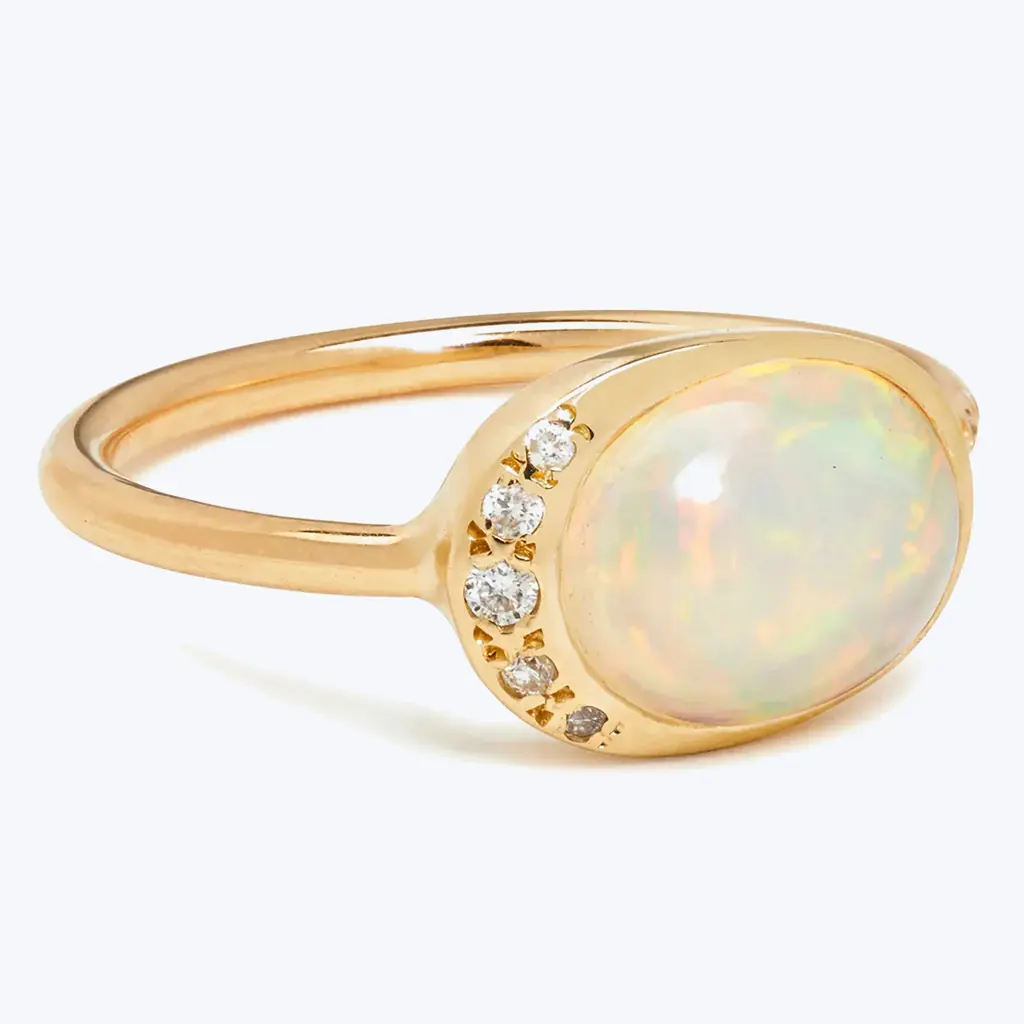Meet the Alice Opal Ring! Cast from solid yellow gold, this opal signet ring features a genuine cabochon Australian opal that is believed to shield against negativity and burn off karma. White diamonds along the band add extra sparkle and dimension. Scosha Jewelry is a colorful, creative combustion of art meets artifact with a signature style that blends the raw with the refined. These luxurious eclectic jewelry pieces are made to be worn casually every day.