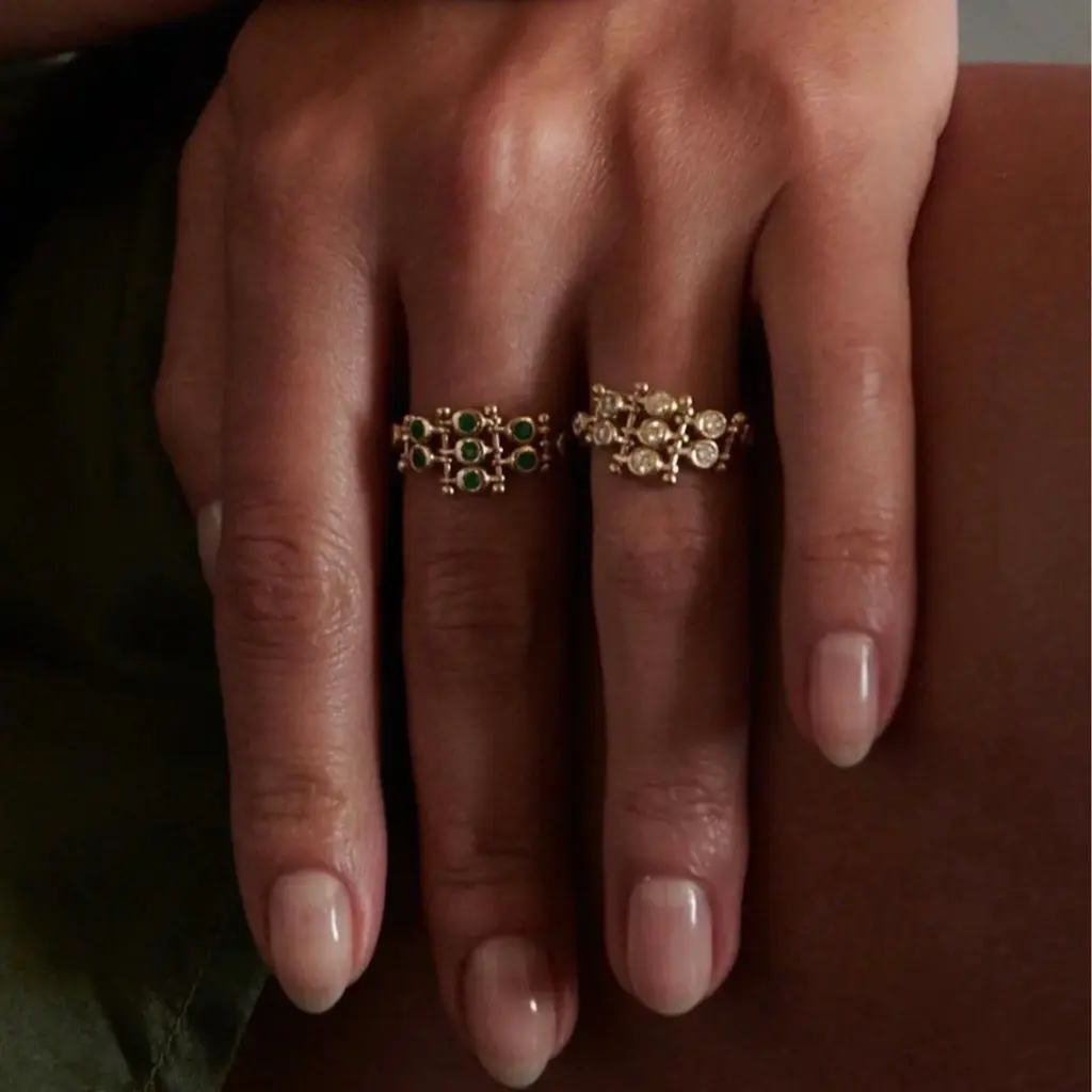 Meet the Diamond Diadem Ring! Rich in detail, this vintage-style cocktail ring is cast from solid gold and features nine interlocking bezels set with bright white diamonds in a unique chain link design. Scosha Jewelry is a colorful, creative combustion of art meets artifact with a signature style that blends the raw with the refined. These luxurious eclectic jewelry pieces are made to be worn casually every day.