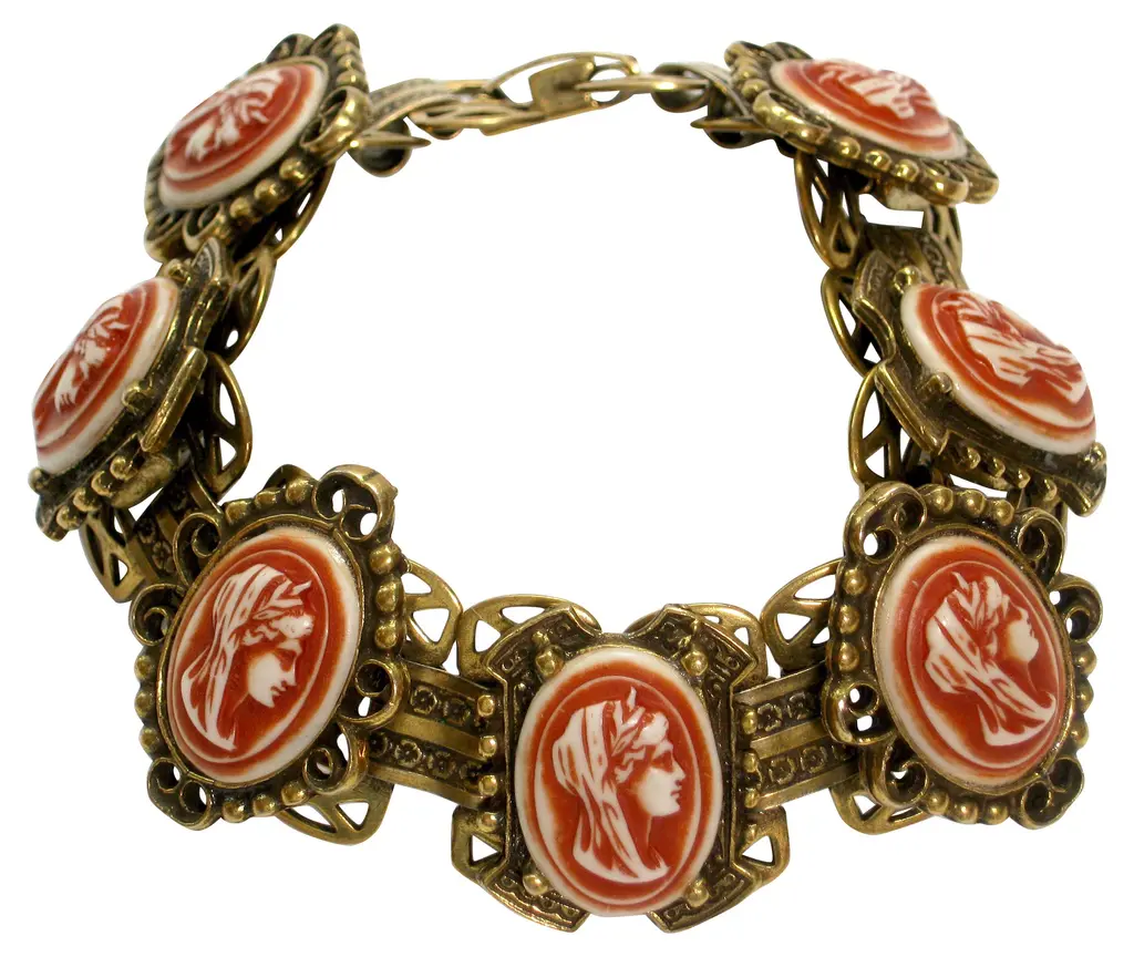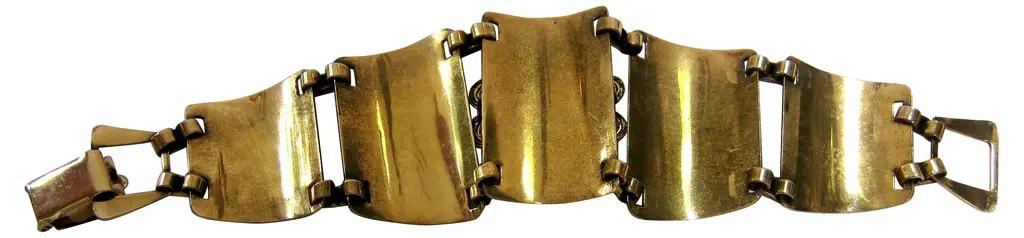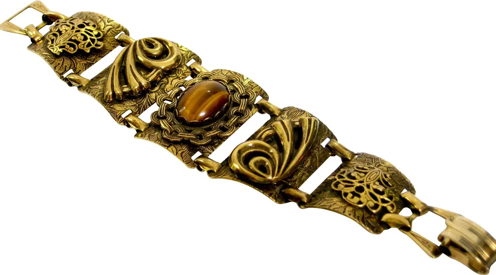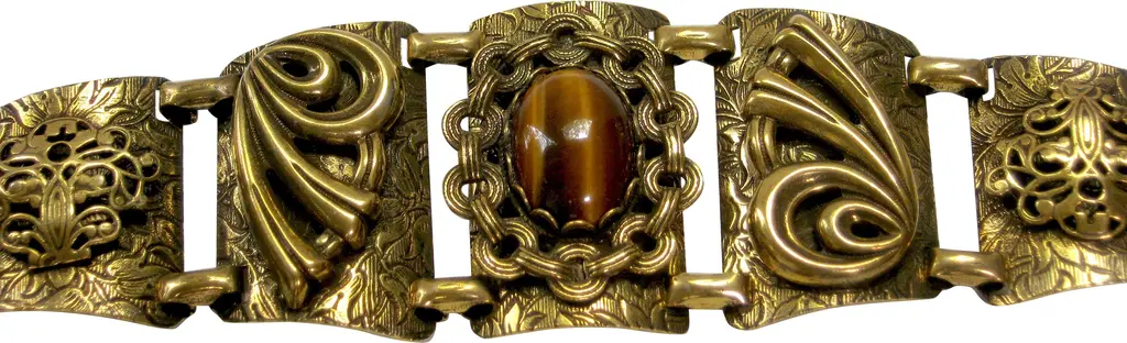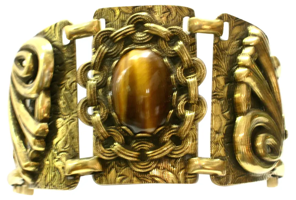 Goldtone metal five-panel tapered link bracelet with tiger's-eye cabochon and fold-over clasp.