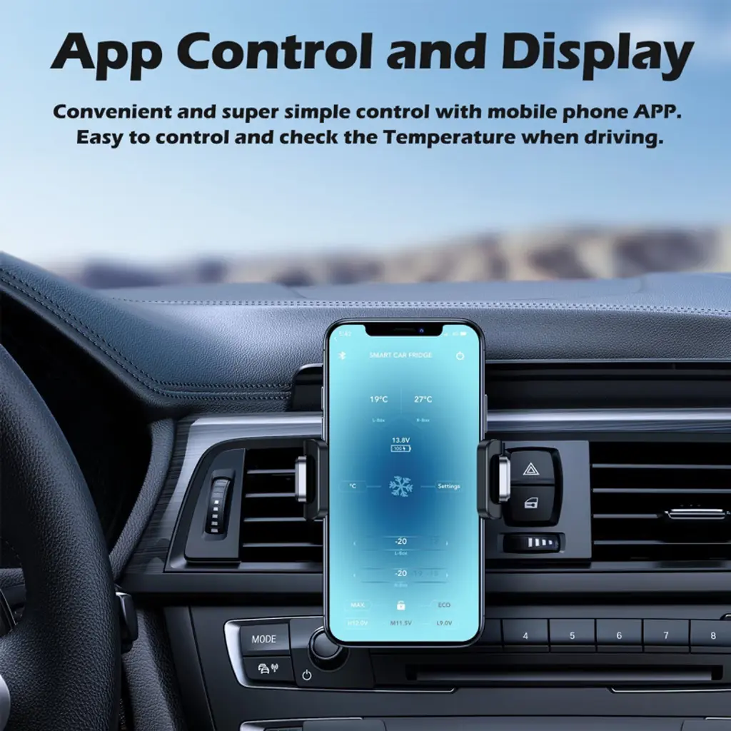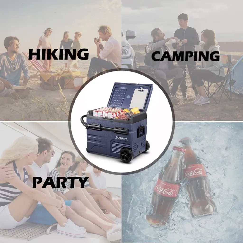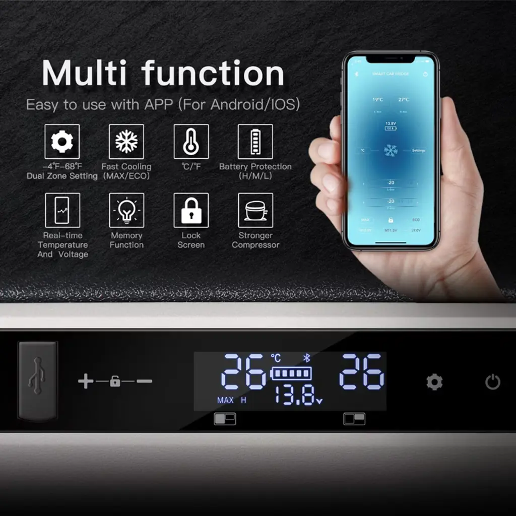 APP control (For Android/IOS), also can manual control.Dual Zone temp independent control. This fridge can hold 66cans cola, or 37 bottles water or 12 bottles red. Wheels,retractable handle, Inside Led Light Design. Battery Protection H/M/L, Max/Eco Cooling Choice. Support 12/24V DC and 100-240V AC. You will get a portable car fridge, 1 cigarette lighter connector, 1 wall plug, 1 wall plug adapter, 1 user manual, 2 baskets.