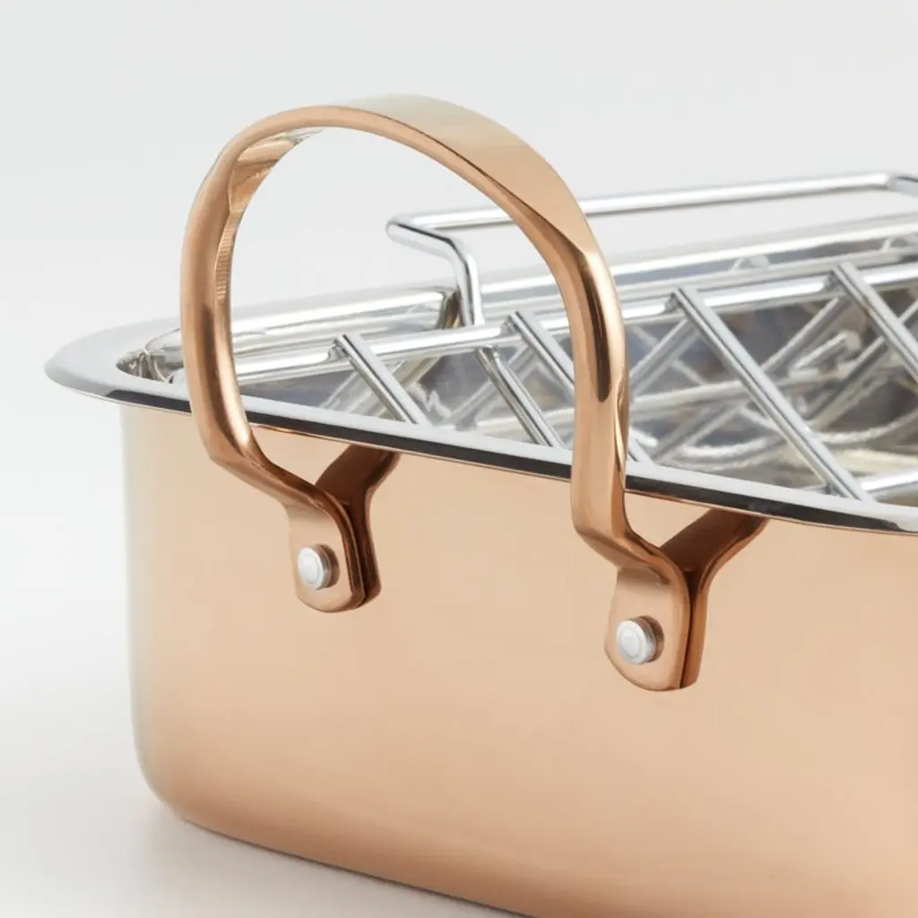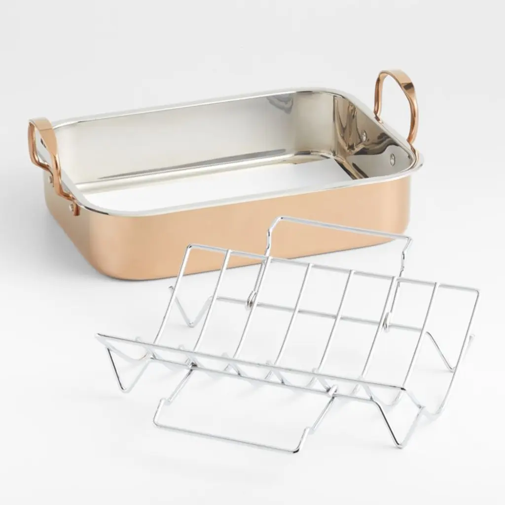 Grace the tablewhether for everyday dinner or a holiday gatheringwith our exclusive copper-plated roasting pan accented by a stainless steel interior and handles. Roast an abundance of root vegetables, bake an impressive pan of mushroom lasagna or cook an entire 20-pound turkey in this mirror-polished roasting pan, which conducts heat excellently. The removable rack allows fats and juices to drain off, creating a crispier skin, and lets you lift out roasted poultry and meats once cooking is complete.