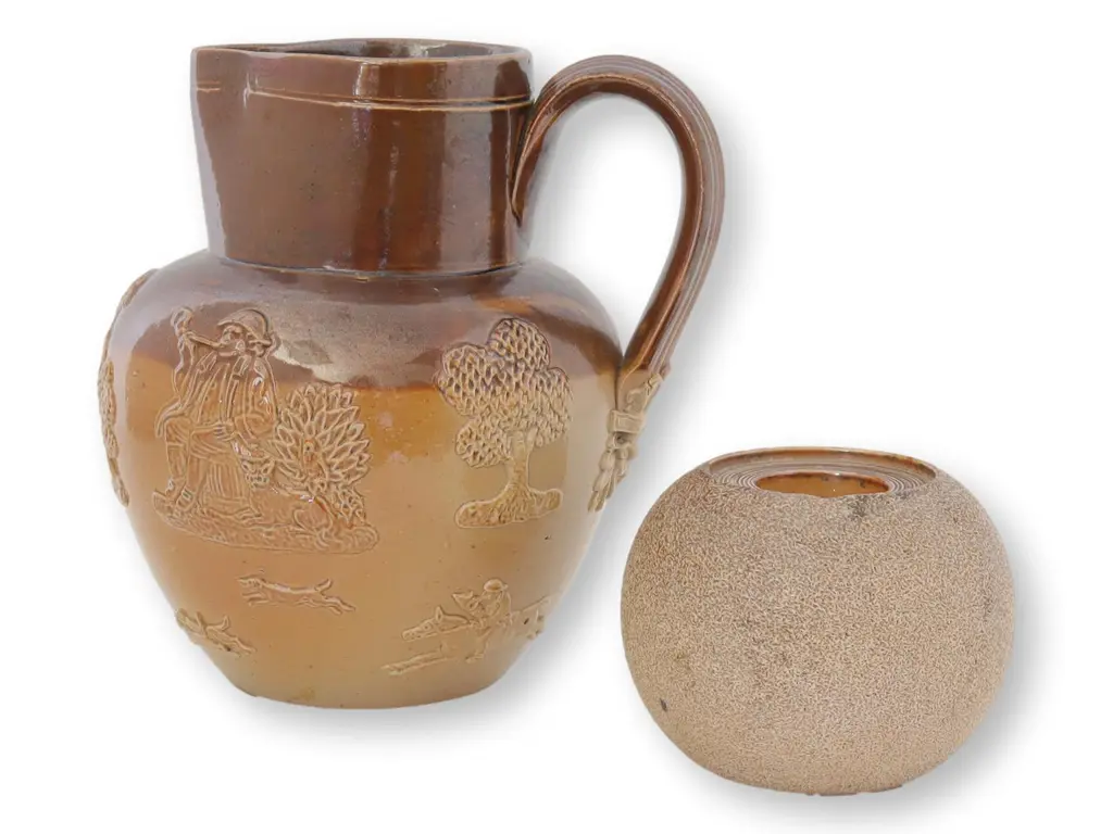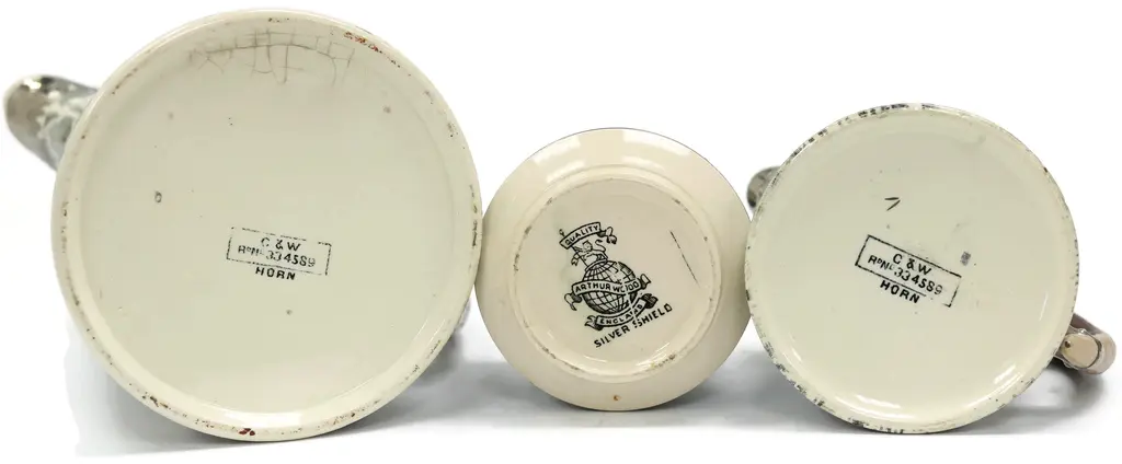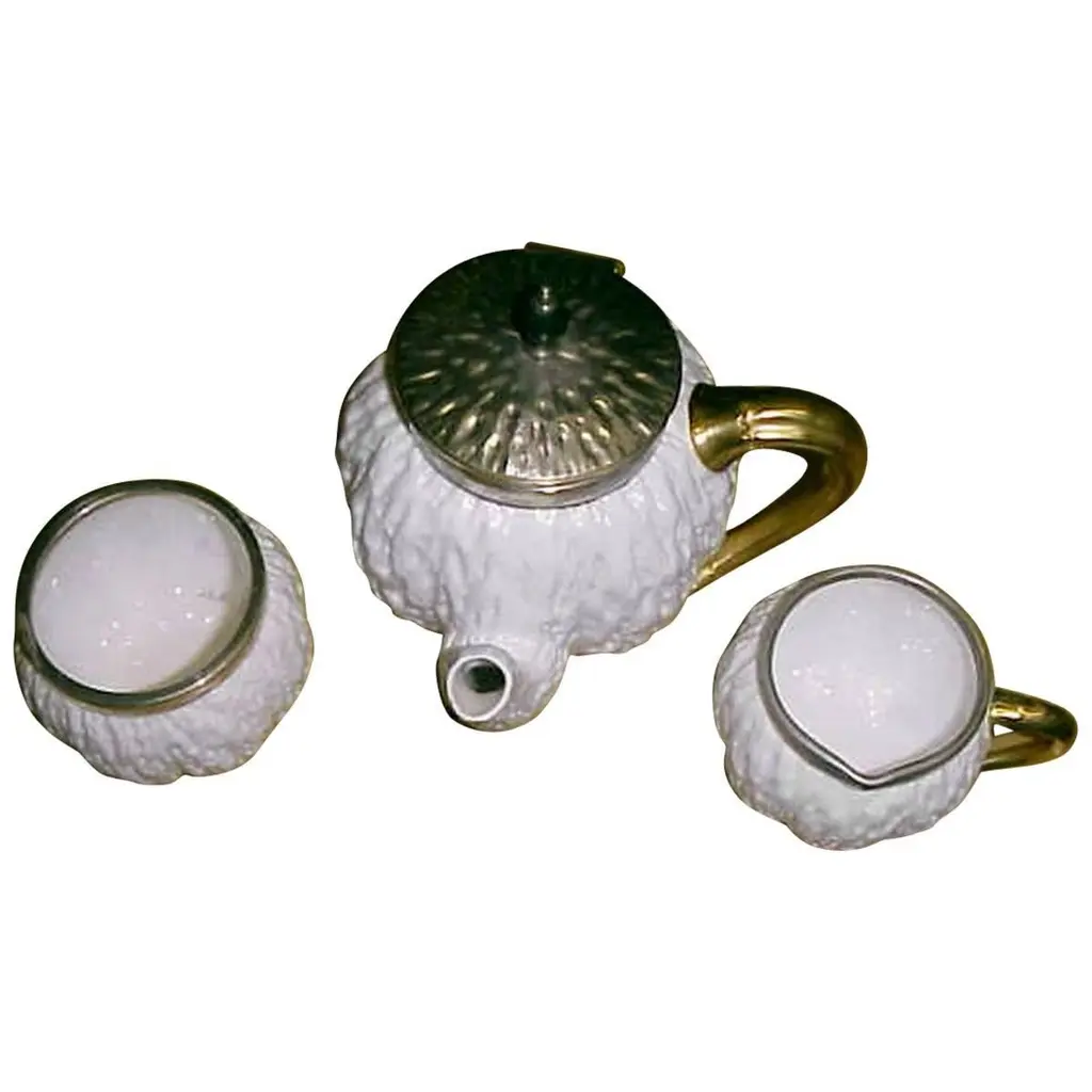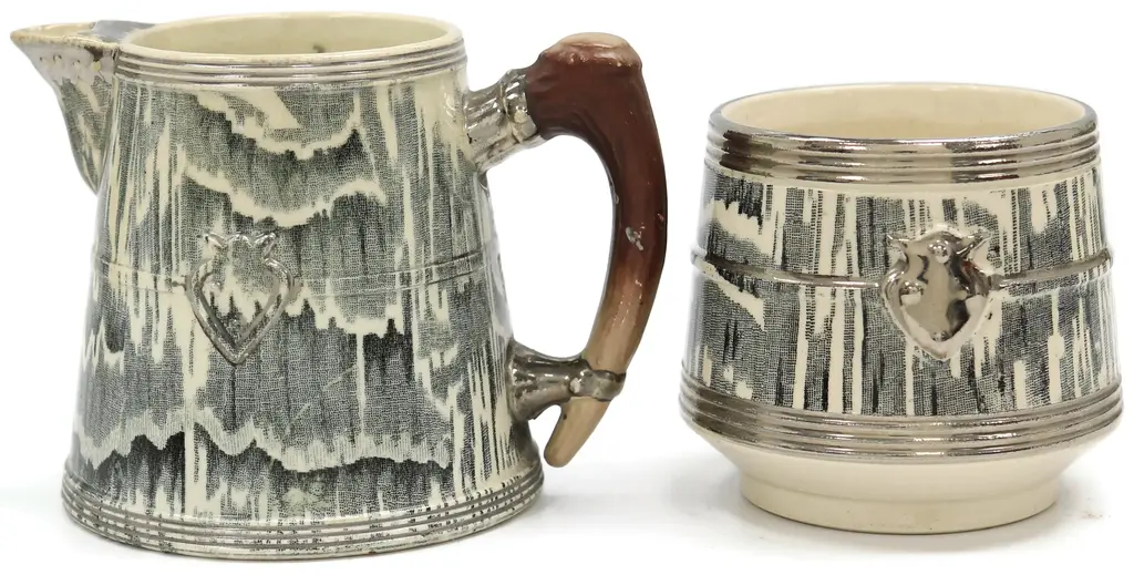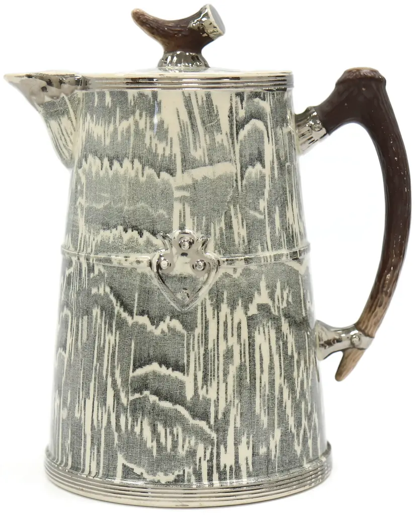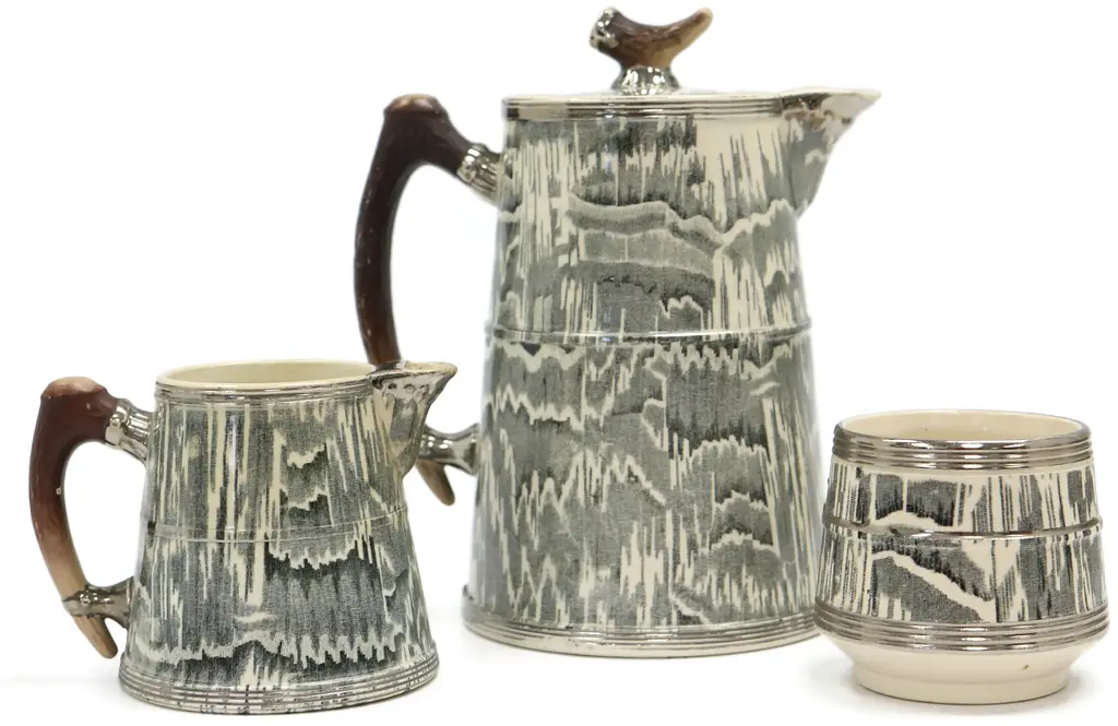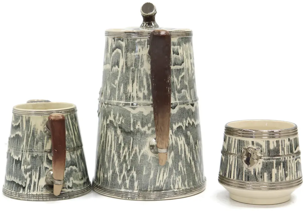Three piece 1930s Silver Shield Faux Bois coffee service. Faux-bois pattern (false wood) faux-antler handle. Shields and accents are all ceramic made to look like antler, wood, and silver. Maker's mark on underside. Dimensions: coffee pot, 6"L x 4.25"W x 6.5"H; creamer, 4.5"L x 3.25"W x 3.25"H; sugar, 3"Dia x 2.25"H.