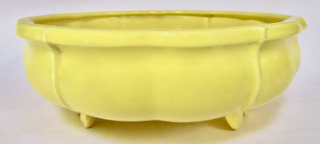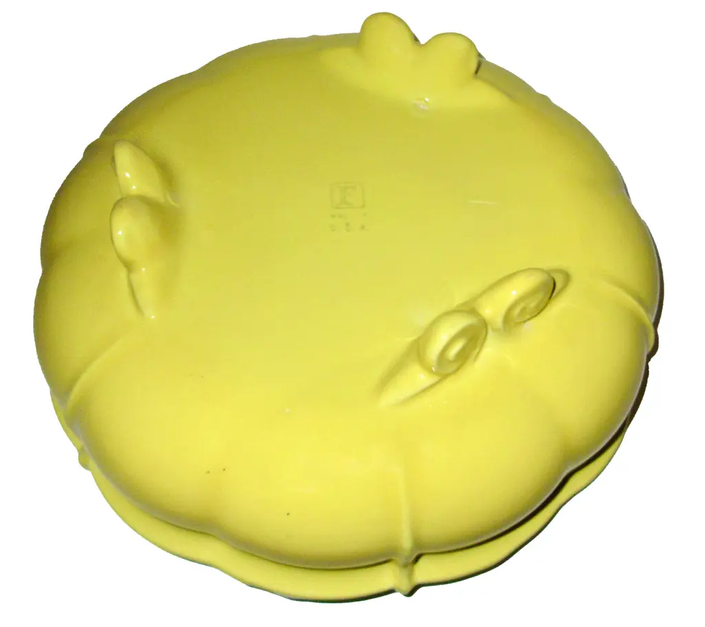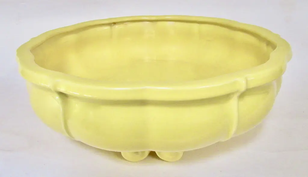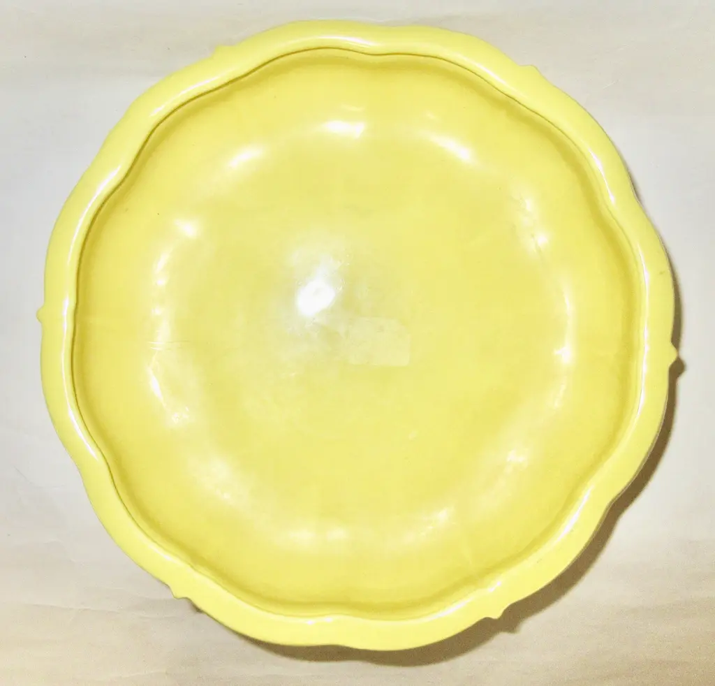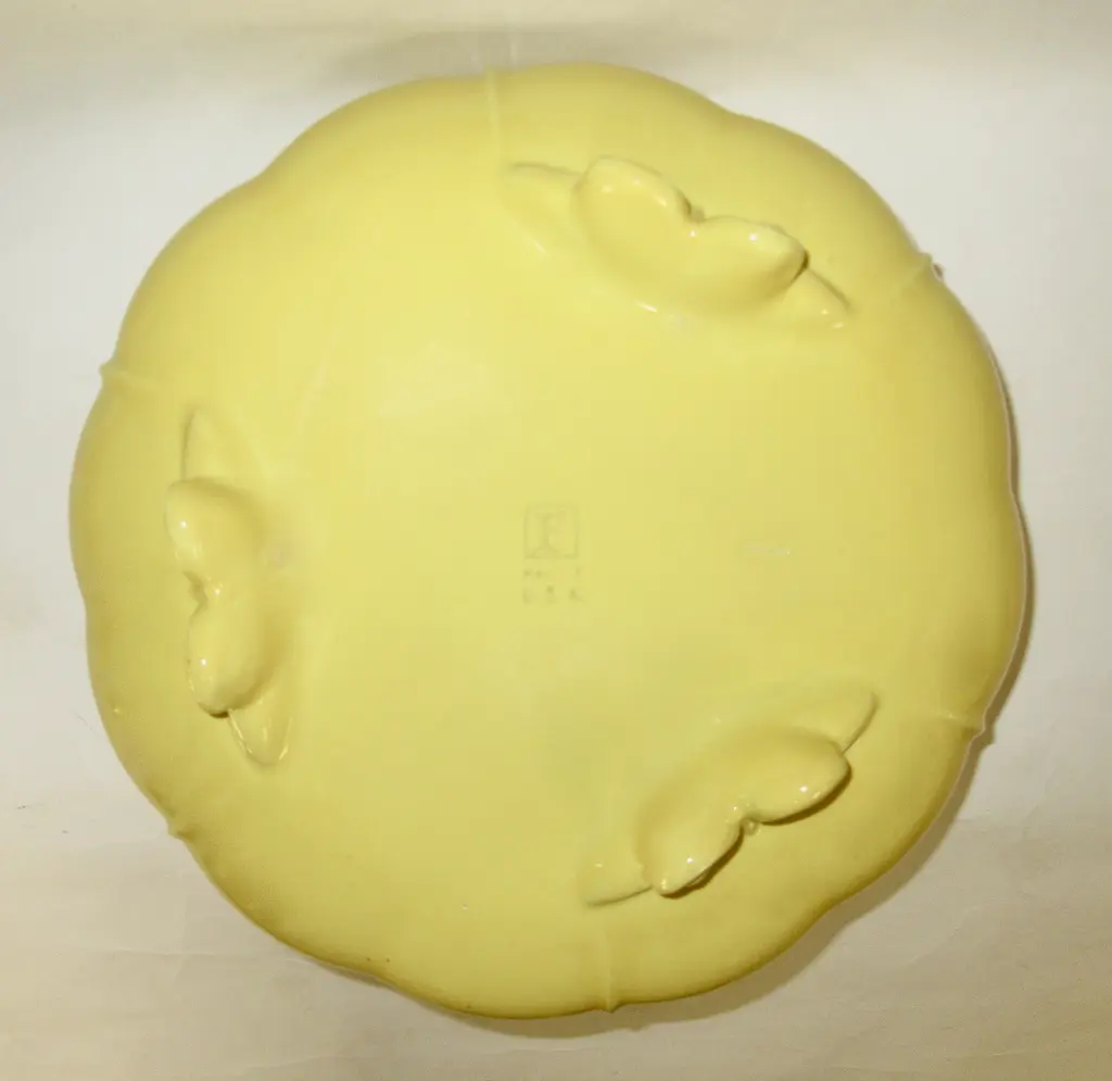 1938 Gladding McBean California pottery serving bowl with three double-scrolled feet, a lipped upper edge, scalloped form, and a rich glossy yellow glaze. Marked "F Made in U.S.A." in a company mark used only in 1938 and also marked "Made in U.S.A."