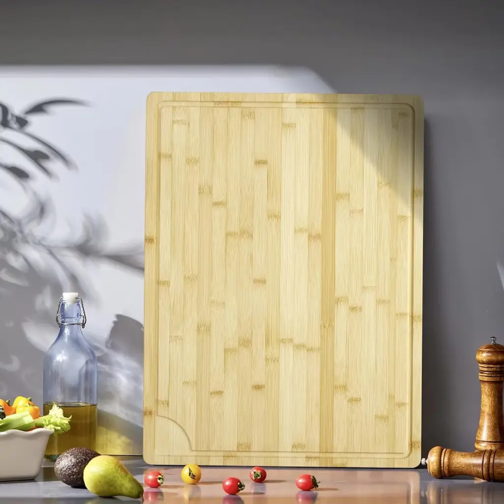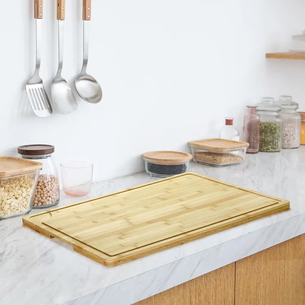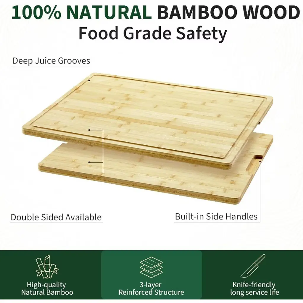 Description: This spacious cutting board measures 24x18 inches with a robust 0.8-inch thickness, giving you ample space to chop, dice, and prepare ingredients or present an attractive spread for guests. The integrated deep juice groove runs along the edge, catching liquids from meat, fruits, and vegetables to keep your countertops clean and tidy as you work. With built-in side handles, this board effortlessly doubles as a serving tray, offering both function and presentation in one piece. Features: Made from premium bamboo, it offers natural resistance to cracking and warping, and its pre-oiled finish ensures it’s ready to use straight out of the box. The board is reversible, so you can use either side for food prep or serving. The ergonomic handles make moving it from kitchen to table simple and safe, perfect for busy family meals or casual gatherings. Specifications: Material: 0.8-inch thick bamboo. Size: 24x18 inches. Pre-oiled for convenience and protection. Deep juice groove for spill-free prep. Two built-in side handles. Easy to clean—just rinse and dry thoroughly after use, and periodically reapply food-grade oil to maintain performance and appearance.