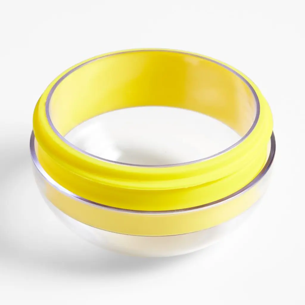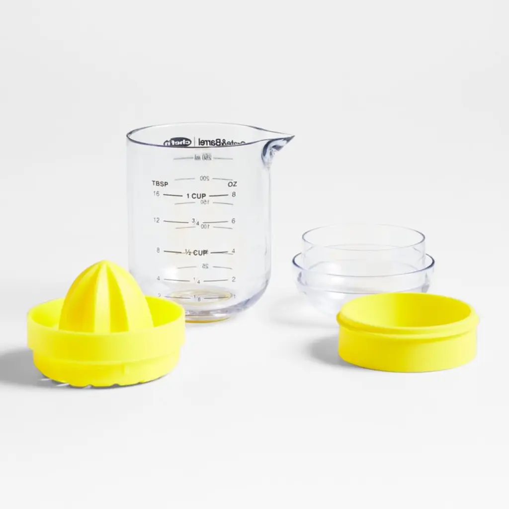 Our ingenious salad dressing shaker makes, shakes, serves and stores salad dressing. Juice lemons or limes directly into the vessel using the sunny yellow citrus reamer, remove the juicer, add your other ingredients, top with the leak-proof lid and shake. Measurement lines mean there's no need for additional measuring cups, and the pouring spout serves dressing with ease. Designed to coordinate with our citrus collection, the shaker stores dressing in the refrigerator so it's ready for lunch bowls and dinner side salads.