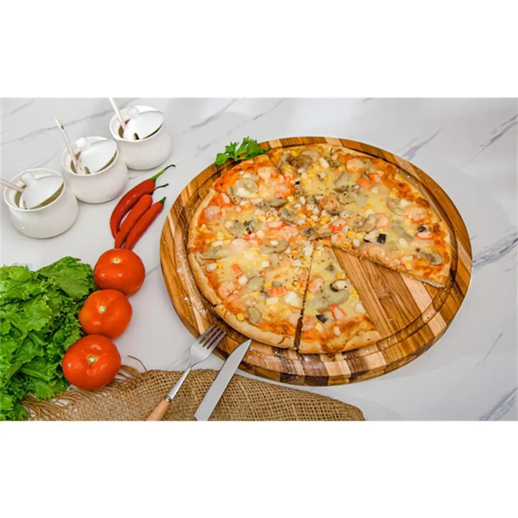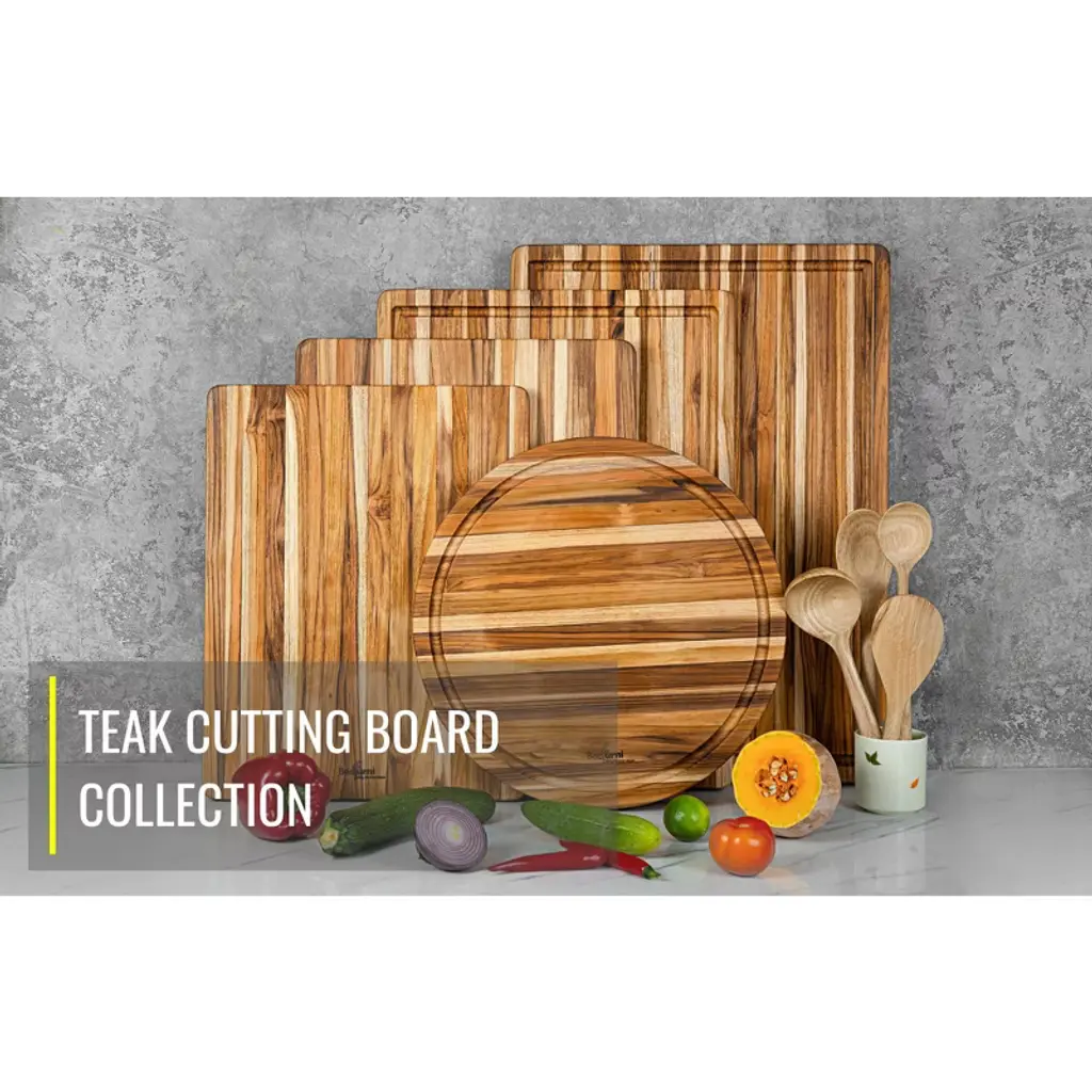 Product DescriptionThis premium teak wood cutting board features a natural pattern with smooth, polished edges for safe, comfortable use. Ideal for chopping, slicing, and serving, it’s perfect for meat, fruit, vegetables, cheeses, desserts, and more. The reversible design and spacious 22" x 16" surface make it versatile for both kitchen prep and stylish serving. Eco-friendly and easy to clean, this durable, non-toxic board is perfect for home kitchens, restaurants, or as a thoughtful housewarming gift. Strong, heat-resistant, and water-resistant, it’s a must-have for both professional chefs and home cooks.Product InformationProduct Name: 5 Packs Rectangular Real Teak Wood Cutting Board SetMain Material: Sturdy WoodColor: BrownProduct Dimensions: 15.75 x 15.75 x 1.25 inchesProduct Weight: 5.9 PoundsShape: RoundUse Case: Kitchen