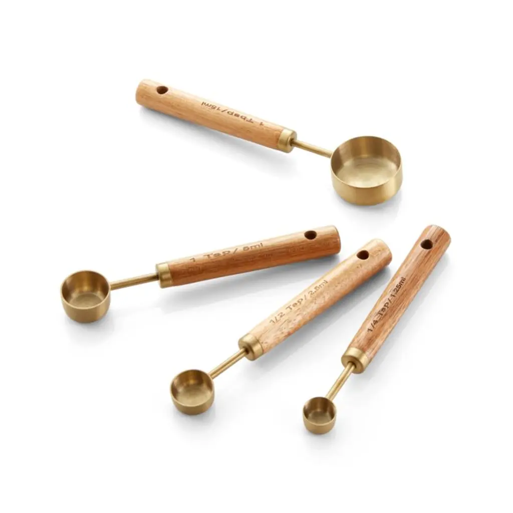 We've mixed sustainable acacia wood handles and gold bowls to elevate the standard measuring spoon set. The satin gold-finished stainless steel scoops add a touch of glamour and shine to the baking process. A Crate & Barrel exclusive, the set makes a fabulous gift for your favorite cookespecially when paired with the matching measuring cups.By choosing FSC®-certified products, you are supporting responsible management of the world's forests.