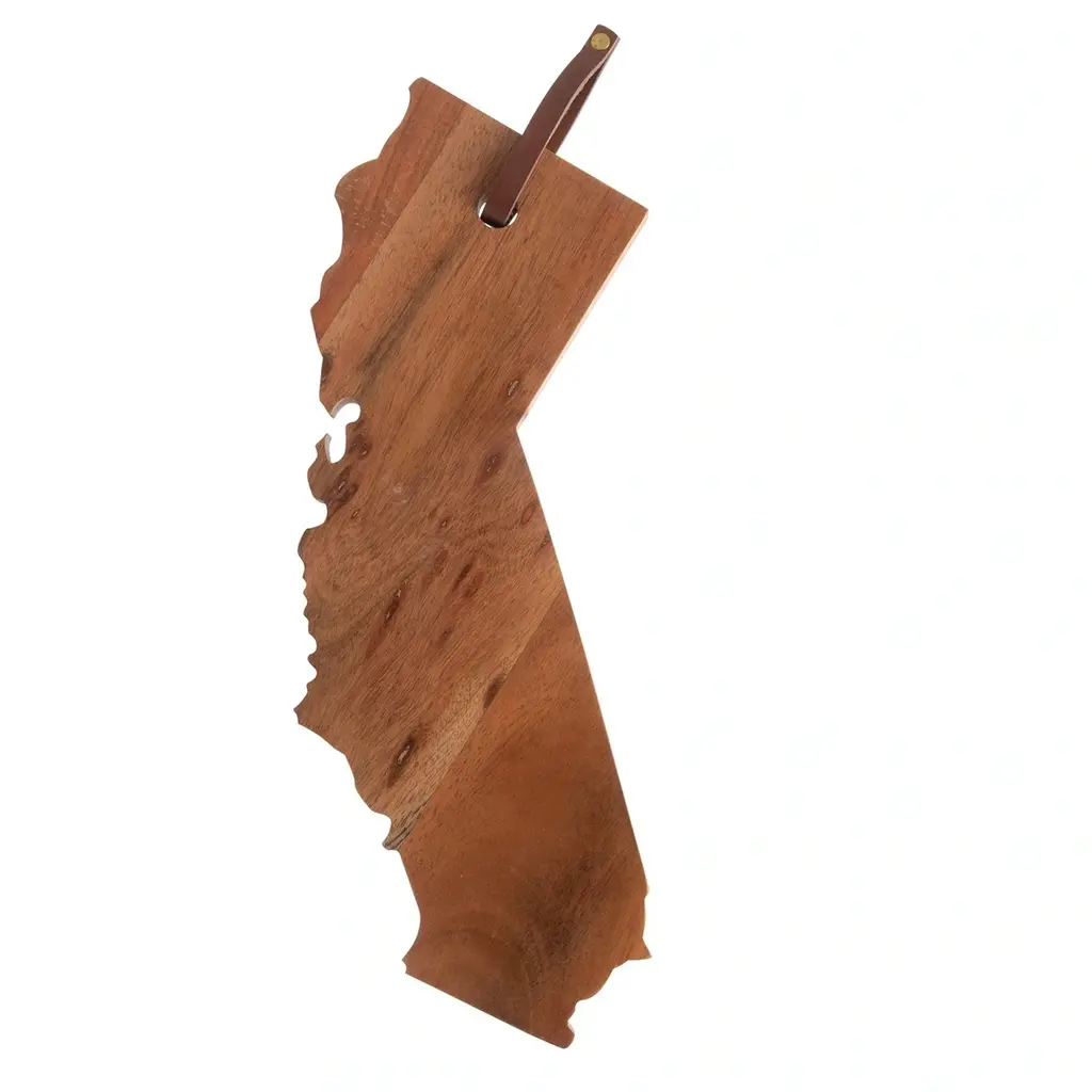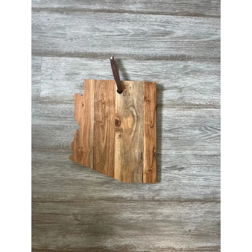 An artisanal state-shaped cutting board crafted from sturdy acacia wood, blending natural beauty with practical functionality. Perfect for showcasing state pride while serving as a versatile kitchen essential, ideal for chopping, slicing, and serving.