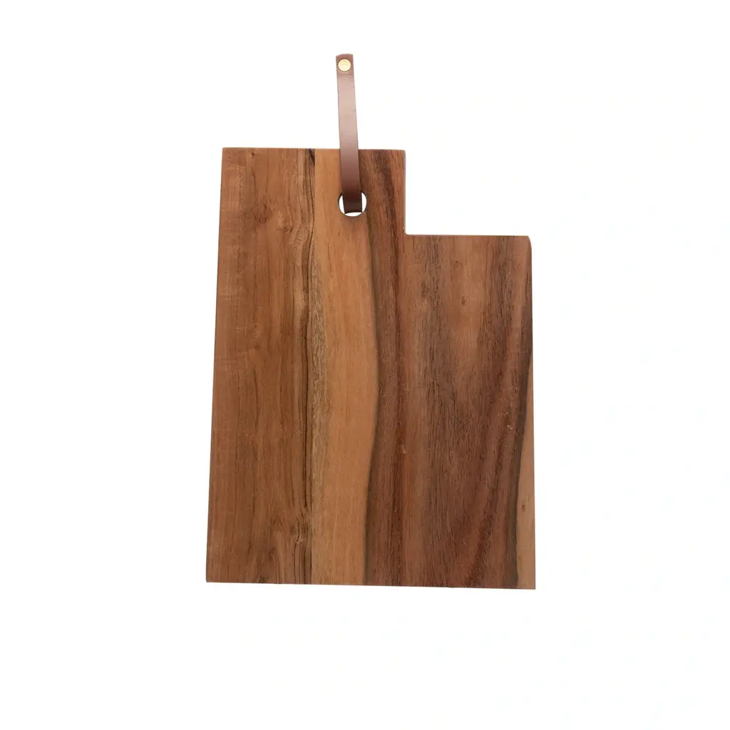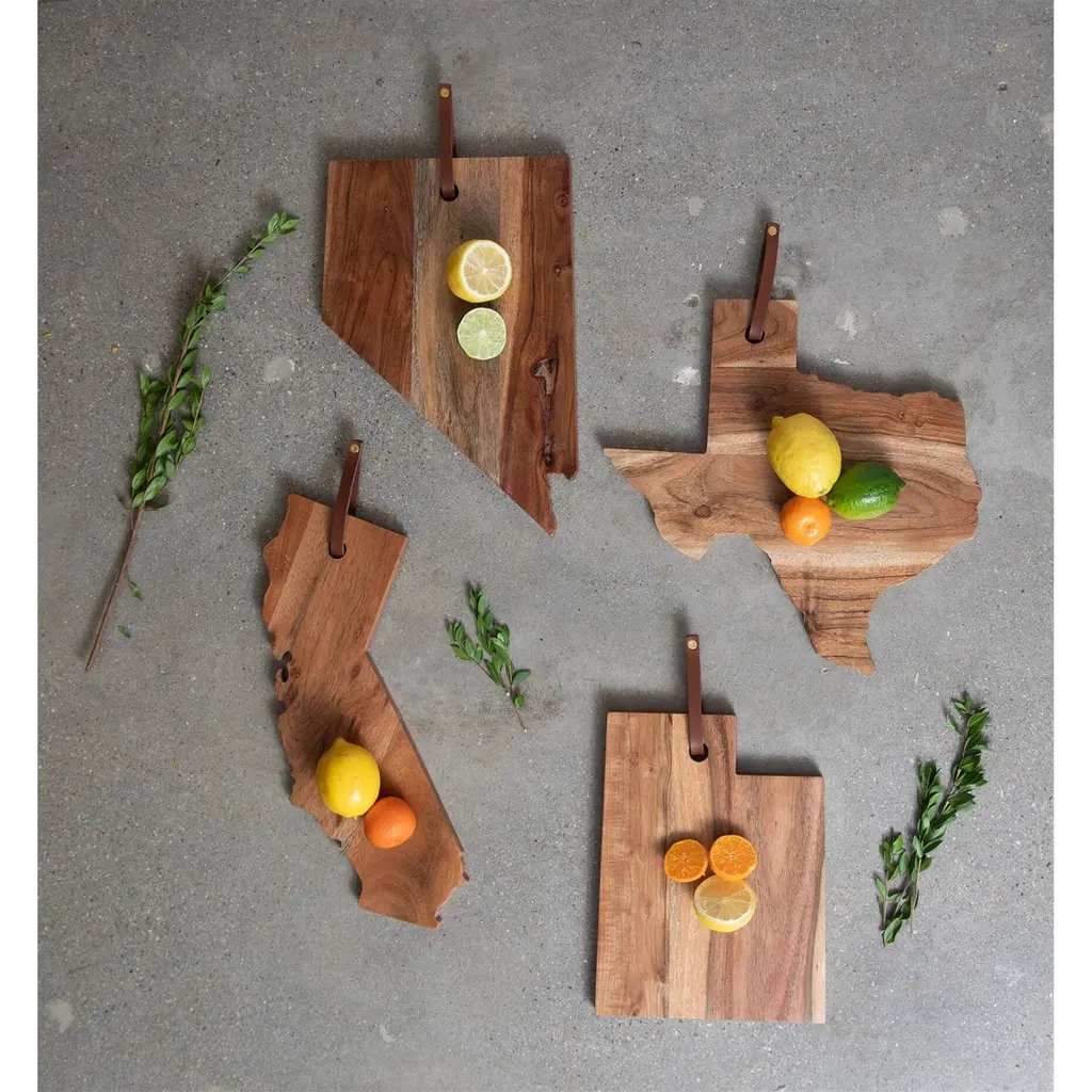 An artisanal state-shaped cutting board crafted from sturdy acacia wood, blending natural beauty with practical functionality. Perfect for showcasing state pride while serving as a versatile kitchen essential, ideal for chopping, slicing, and serving.