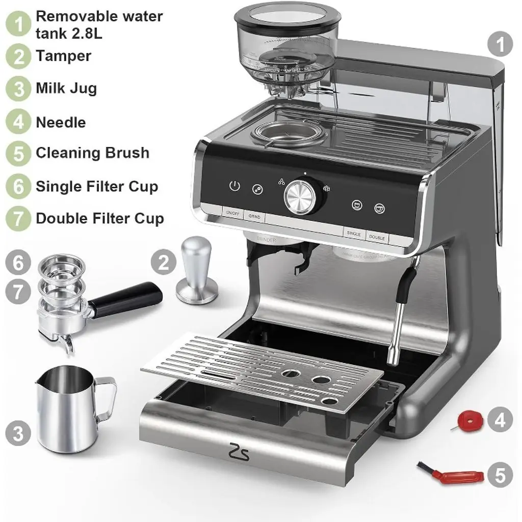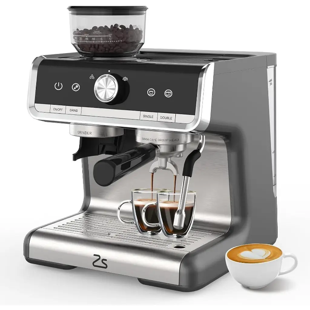 Acekool 20 Bar Espresso Machine, Conical Burr Grinder & Steam Wand, Pid Control, 95oz Water Tank, Stainless Steel, Latte & Cappuccino, Silver Gray