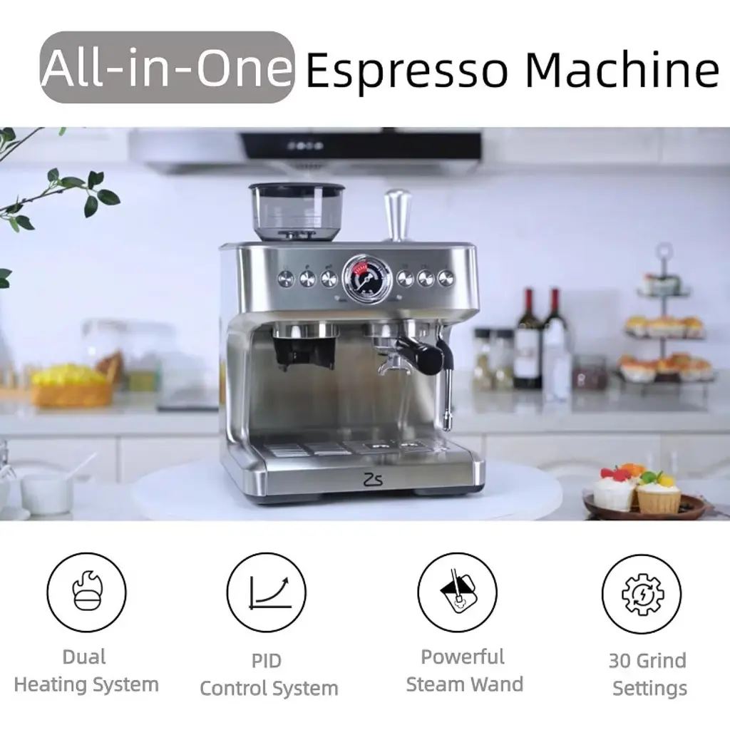 Acekool Stainless Steel Espresso Machine With Built-in Grinder, 15 Bar Semi-automatic Coffee Maker, Fast Heating, Pid, Silver 120v/60hz/1500w