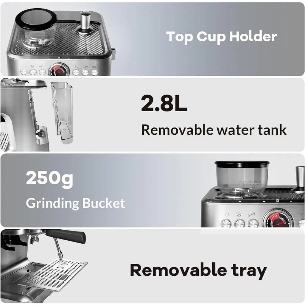 Upgrade your daily coffee ritual with the Acekool Stainless Steel Coffee Machine. This machine is engineered for both style and performance, offering a semi-automatic brewing experience that delivers consistent and rich results. With a 15 Bar Italian pump and a fast-heating system, each cup features a thick crema and bold flavor, suitable for espresso, cappuccino, or a classic Americano. The built-in conical burr grinder provides 30 adjustment settings, so you can easily find the right grind for any preference. The 250g bean hopper allows you to use freshly ground beans for every cup. PID temperature control and extraction tracking ensure accuracy and reliability, while adjustable cup capacity and the auto-purge function help maintain ideal brewing conditions in every cycle. The 360° steam wand creates smooth microfoam for lattes and cappuccinos. A 2.8L transparent water tank and removable stainless steel drip tray make refilling and cleaning simple. Safety is a priority—this machine is ETL certified and food-contact compliant, offering protection features such as overheating and overpressure safeguards. A descaling reminder helps keep maintenance easy. The package includes a 58mm portafilter, tamper, and milk jug, giving you everything needed for a complete espresso experience at home. Designed for American sockets with a brushed stainless steel finish, this espresso maker fits seamlessly into kitchens, offices, or any space where quality coffee is appreciated.