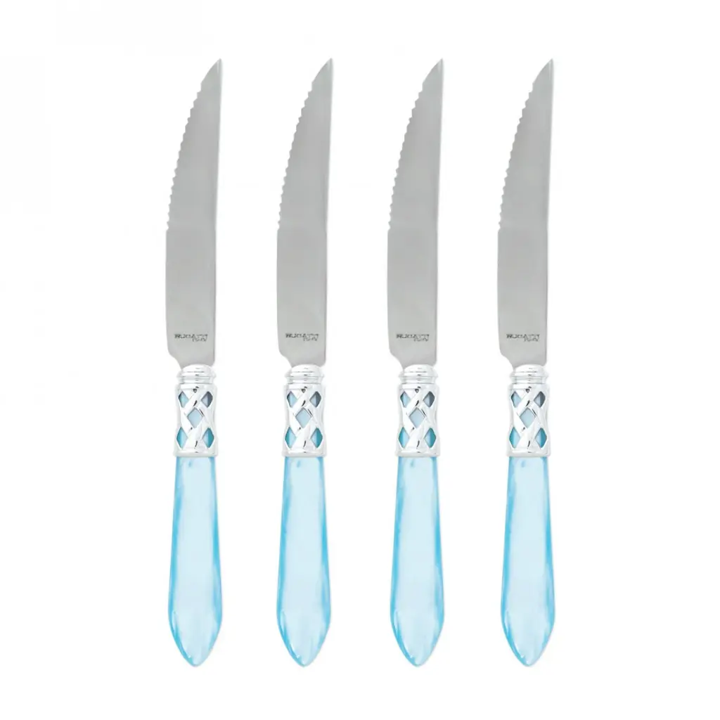 The Aladdin Antique Steak Knives feature elegant pearlized handles with the strength of high-grade acrylic and 18/10 stainless steel. This set is also available in our brilliant finish. Since 1983, Vietri has specialized exclusively in Italian handcrafted ceramics, stainless and pewter flatware, mouth blown glassware, lamps, urns and planters. Families of artisans with 3 or 4 generations of history create these special pieces using centuries-old techniques. The subtle color from a paintbrush and the curving stroke of the artist's hand are never repeated in quite the same way, making each piece truly unique.