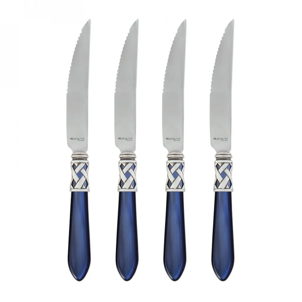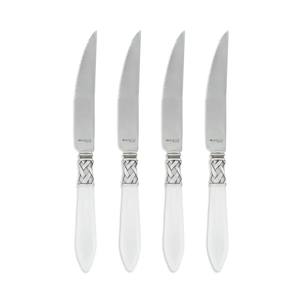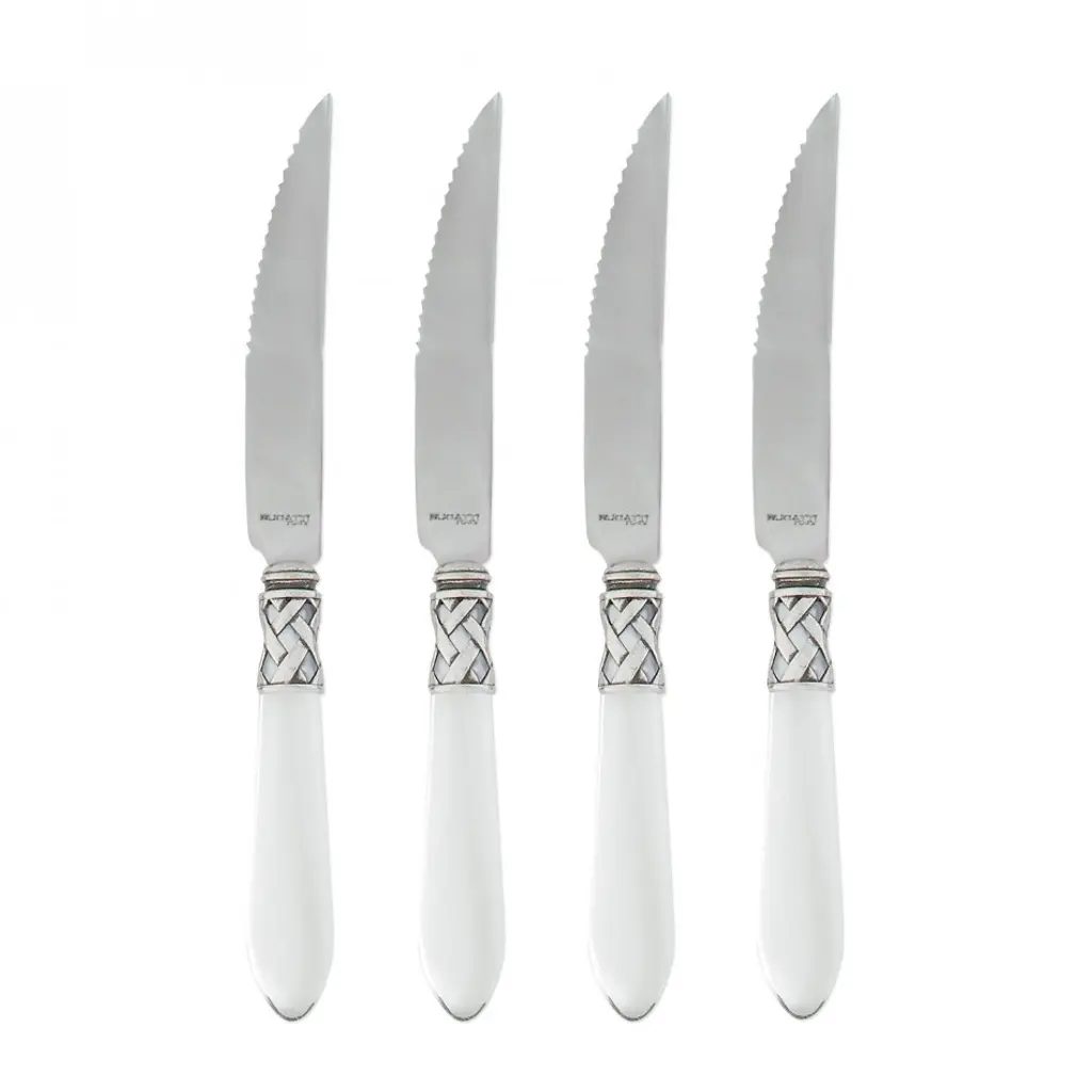The Aladdin Antique Steak Knives feature elegant pearlized handles with the strength of high-grade acrylic and 18/10 stainless steel. This set is also available in our brilliant finish. Since 1983, Vietri has specialized exclusively in Italian handcrafted ceramics, stainless and pewter flatware, mouth blown glassware, lamps, urns and planters. Families of artisans with 3 or 4 generations of history create these special pieces using centuries-old techniques. The subtle color from a paintbrush and the curving stroke of the artist's hand are never repeated in quite the same way, making each piece truly unique.