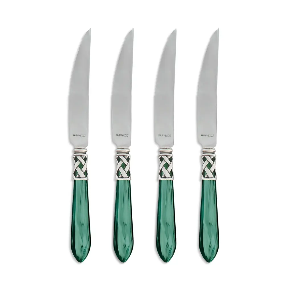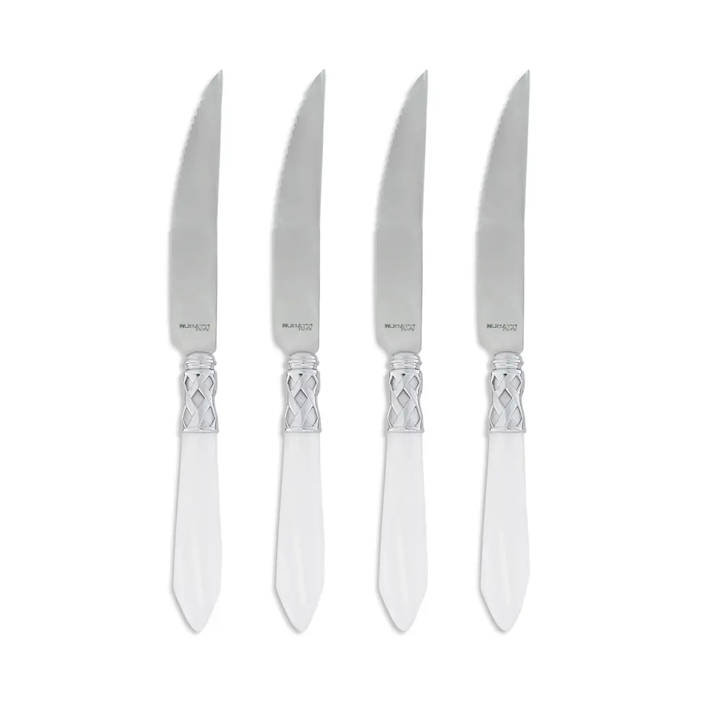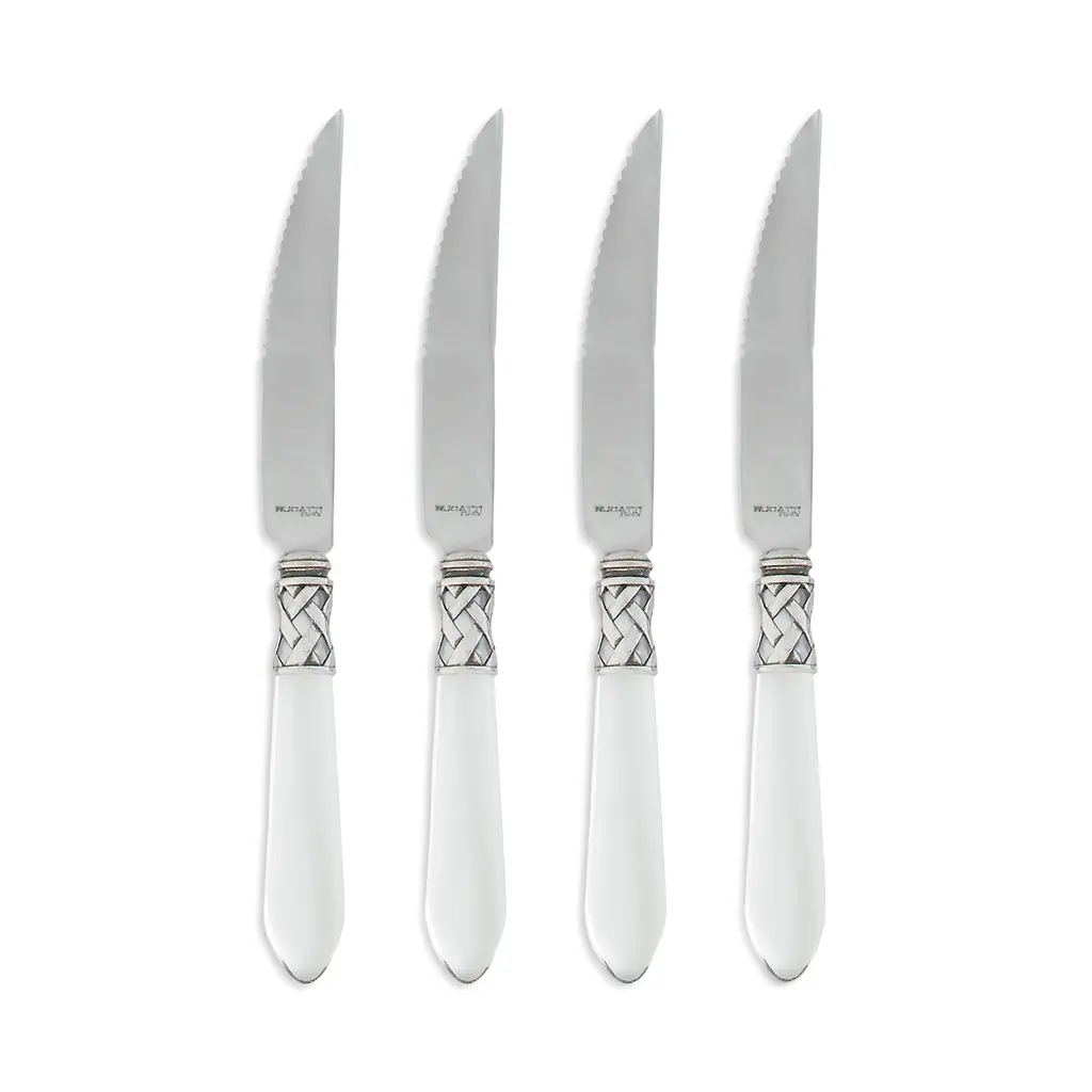 The Aladdin Antique Steak Knives feature elegant pearlized handles with the strength of high-grade acrylic and 18/10 stainless steel. This set is also available in our brilliant finish. Since 1983, Vietri has specialized exclusively in Italian handcrafted ceramics, stainless and pewter flatware, mouth blown glassware, lamps, urns and planters. Families of artisans with 3 or 4 generations of history create these special pieces using centuries-old techniques. The subtle color from a paintbrush and the curving stroke of the artist's hand are never repeated in quite the same way, making each piece truly unique.
