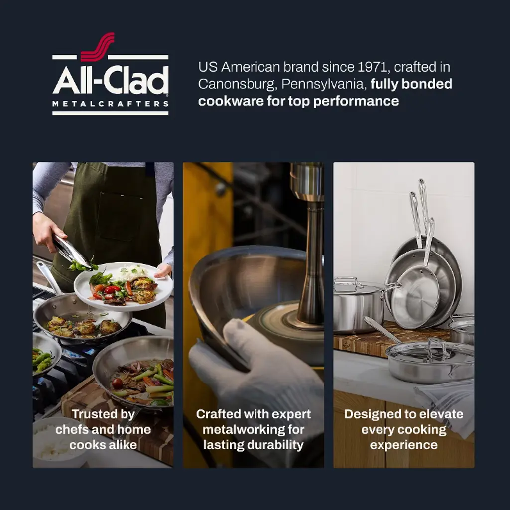 You spoke, we listened. The Essentials Nonstick collection is thoughtfully designed to allow you to cook, serve, clean, and store with ease. Essential, multi-purpose pieces move seamlessly from stovetop to oven to table and back into your cabinets, where they nest without scratching the PFOA-free nonstick surface. Fry, steam, roast, boil and strain without worry - cleanup is a breeze! This set includes two useful sauce pan sizes, a 2.5 quart and 4 quart, both with lids, perfect for preparing grains, rice, and small batches of sauces and soupsAbout Us: For over 50 years, All-Clad has been crafting premium cookware in Canonsburg, Pennsylvania—the heart of America’s steel and aluminum industry. Founded in 1971, we draw on the region’s unmatched metalworking expertise to create fully bonded cookware known for its exceptional performance and lasting durability. Trusted by chefs and home cooks alike, All-Clad represents American craftsmanship at its finest designed to elevate every cooking experience for generations to come.
