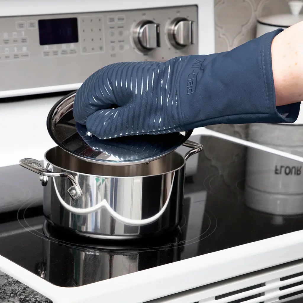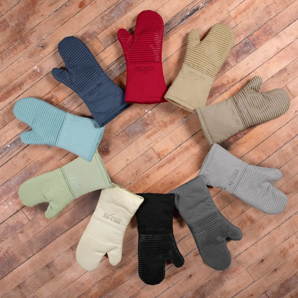 A handy essential for any kitchen, this set of two All-CladⓇ Silicone Oven Mitts dependably keeps the heat off of you. Masterfully constructed with 100% heavyweight cotton twill, these durable oven mitts are silicone-treated on both sides to ensure both right- and left-handed users enjoy heat protection up to 500℉ (260℃). All-CladⓇ Silicone Oven Mitts offer plenty of flexibility, conforming to the shape of hot cookware, which means you can handle hot dishes with confidence. Choose from a variety of charming colors that fit your personal palette. Machine washable for hassle-free cleaning.