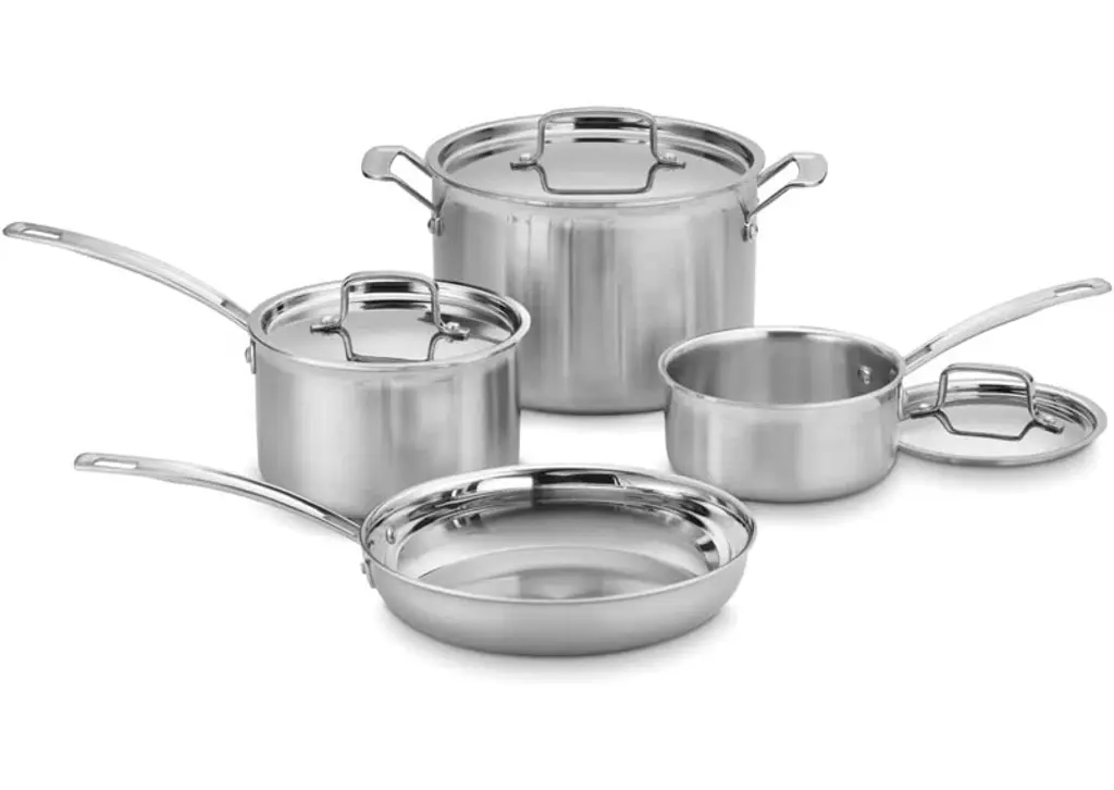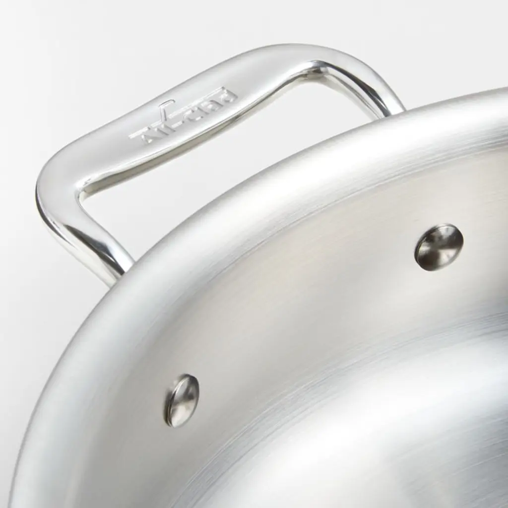 Braise, brown, sear and stew using this premium cookware set designed with a three-ply construction for rapid and even heat distribution. The cooking surfaces and exteriors are premium stainless steel for impeccable frying, while the thick-gauge aluminum cores heat quickly. Oven-safe to high temperatures, the pans boast securely riveted handles and drip-free pouring rims that neatly serve sauces, curries and scrambled eggs. Crate & Barrel exclusives, the pans boast unique contoured comfort handles and brushed stainless steel exteriors.Need help choosing? View our All-Clad comparison chart.All-Clad has been crafting cookware since 1971.