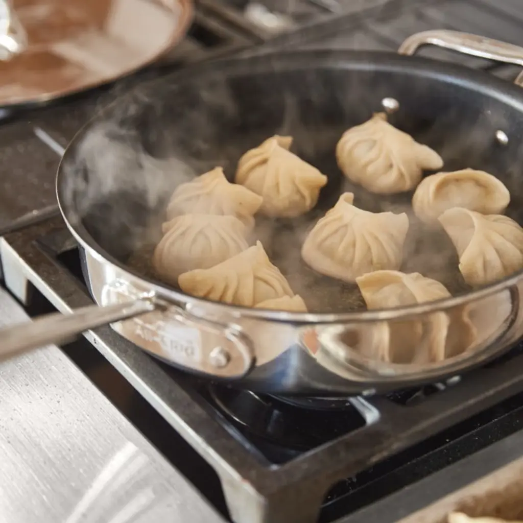 Deeper than a traditional frying pan, this saute pan from All-Clad features a large surface area and tall, straight sides to keep in juices and allow for easy turning. Bonded to the aluminum core is a stainless steel interior that sears impeccably and a magnetic stainless exterior polished to a high shine. Tight-fitting stainless lid locks in heat, moisture and flavor, adding steaming, braising and warming capabilities to the mix. The long, securely riveted handle stays cool while cooking.Need help choosing? View our All-Clad comparison chart.