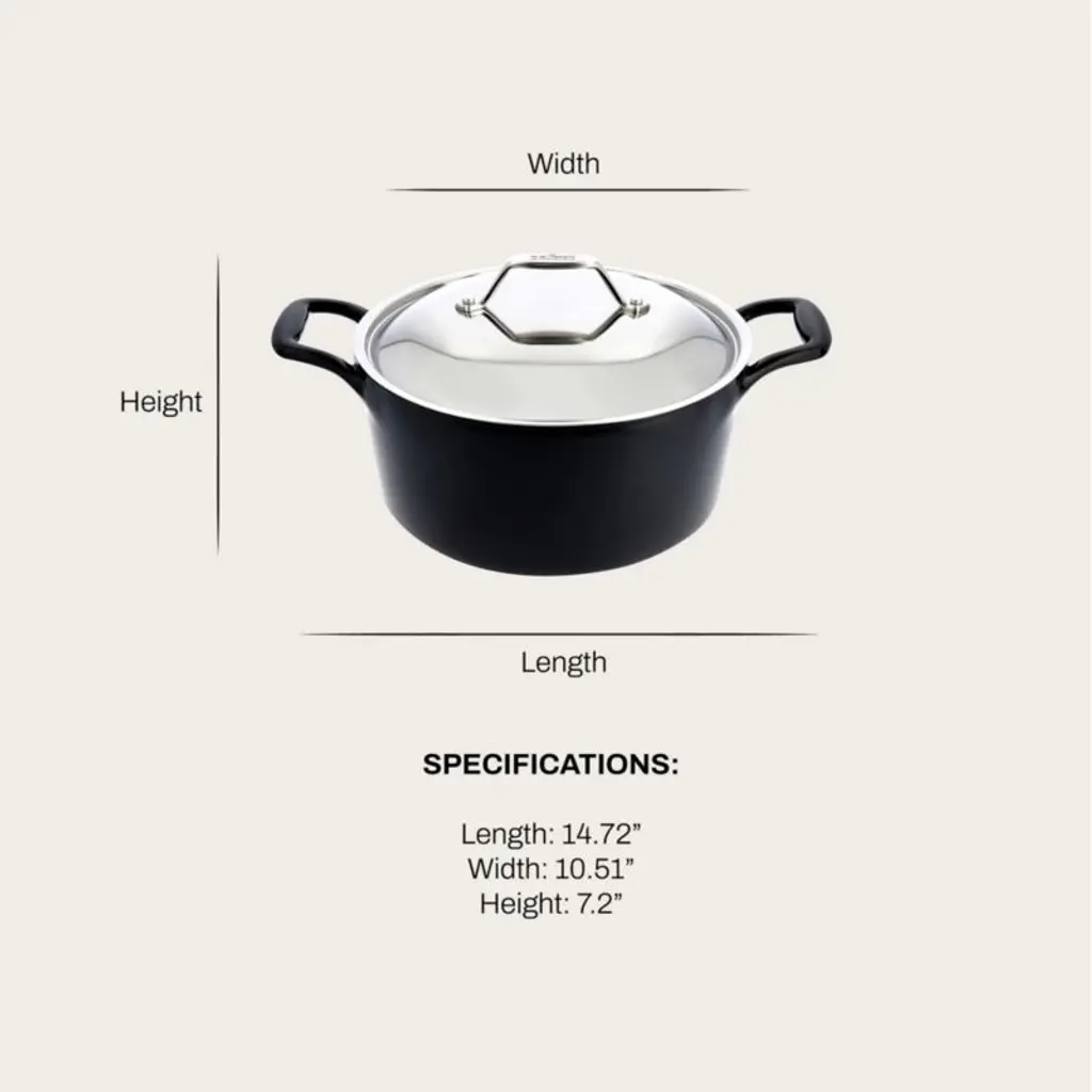 Designed to do it all, this Dutch oven braises, deep fries, bakes and stews. The cast iron distributes and holds heat evenly on the stovetop or in the ovenno seasoning requiredwhile the black enamel finish resists scratches and stains. High sides make it easy to stir, the stainless steel lid seals in heat and moisture, and the extra-wide handles provide a comfortable grip (even with oven mitts).All-Clad has been crafting cookware since 1971.