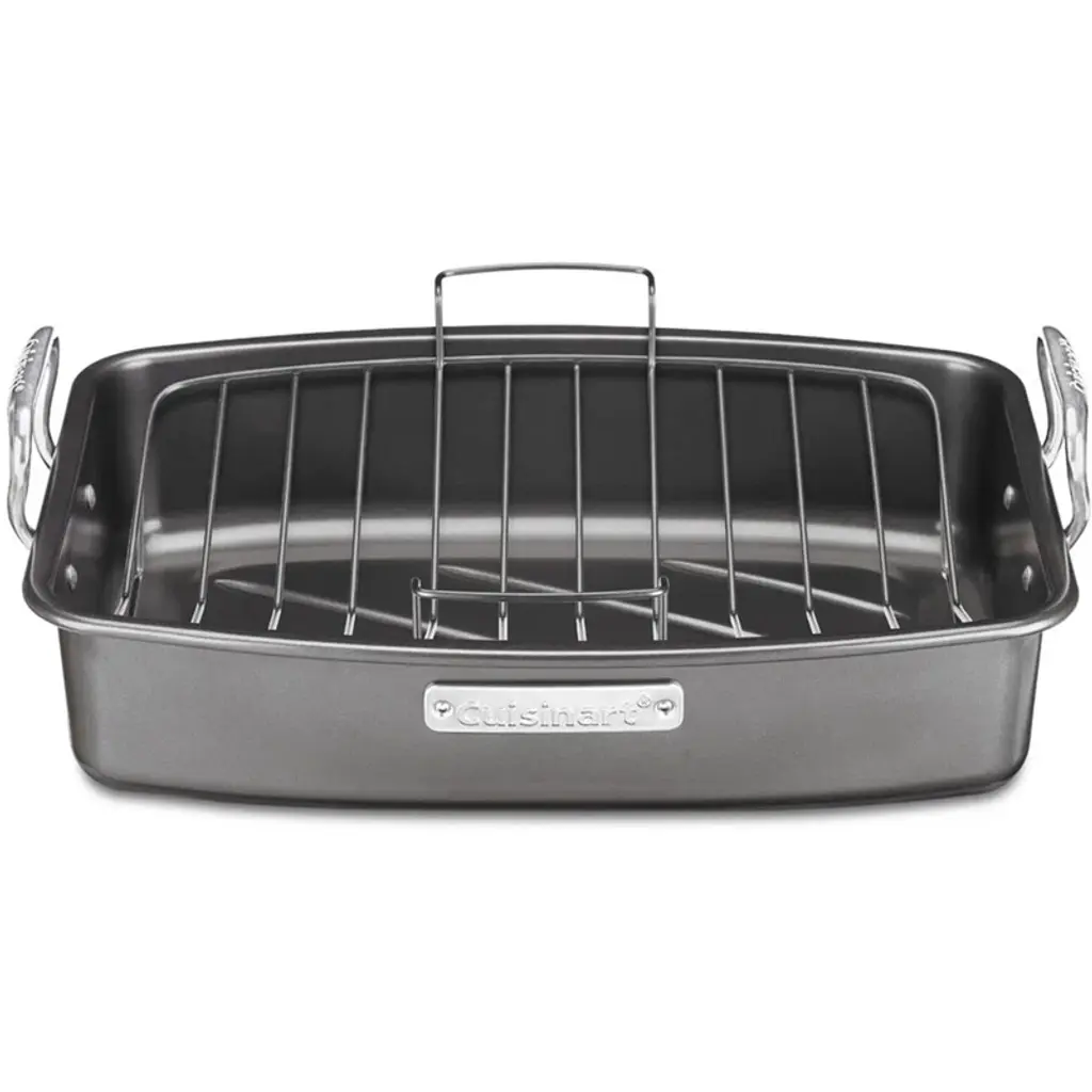 Roast like an expert. This non-stick roasting pan creates perfectly cooked meats, from a holiday turkey to a weeknight roast. Constructed of hard-anodized aluminum for fast heating, the pan boasts a stainless steel base that resists warping and heats evenly. High sides are ideal for preventing spills or splattering, and the large comfort-grip handles make for safe and convenient transport. The non-stick rack encourages air to circulate around roasting meats for even browning while allowing flavorful juices to pool below for basting, glazing or a gravy base.All-Clad has been crafting cookware since 1971.Need help choosing? View our All-Clad comparison chart.