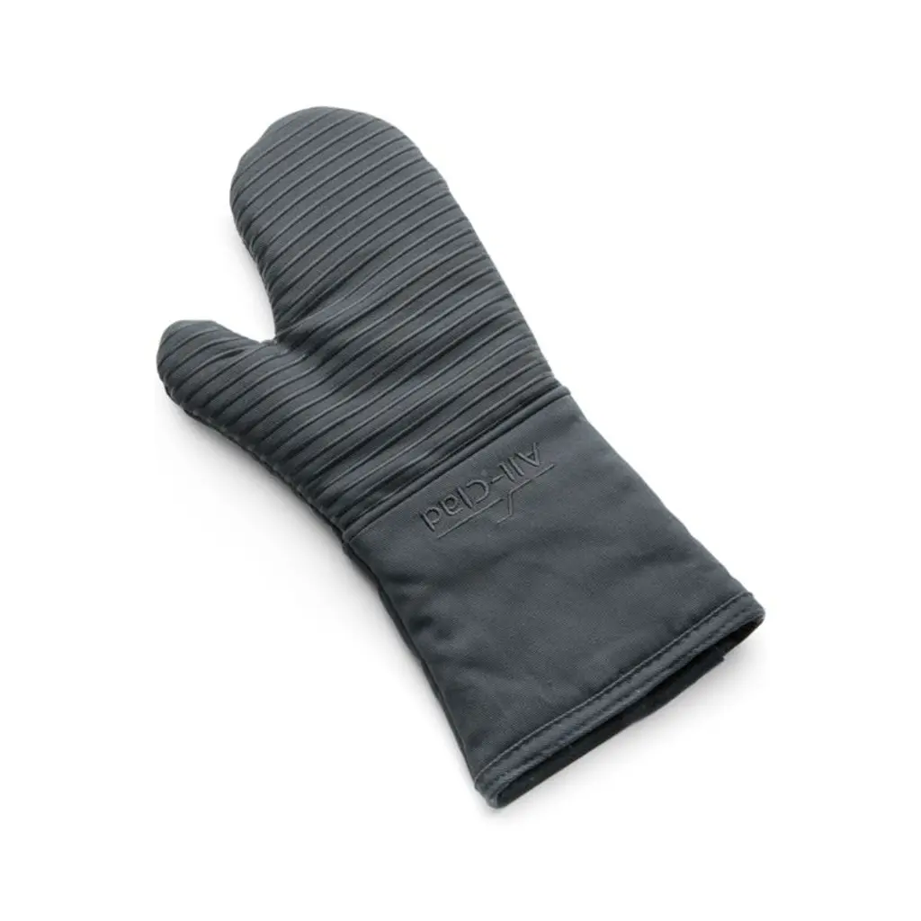 Embroidered stripes and a silicone finish provide a sturdy grip on hot pots, pans and plates. Protect your hands as you cook and bake with this set cotton oven mitt in deep pewter grey. The elongated construction also shields forearms from hot oven racks and other pots on the stove. For coordinated cooking, pair with the matching pot holder.All-Clad has been crafting cookware since 1971.