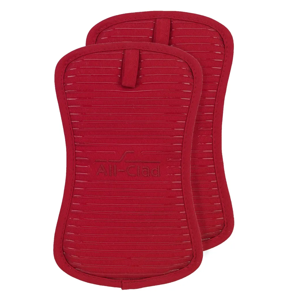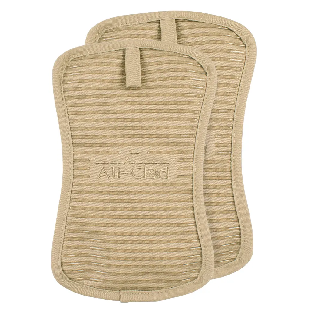Embroidered stripes and a silicone finish provide a sturdy grip on hot pots, pans and plates. Protect your hands as you cook and bake with this set of cotton pot holders in deep pewter grey, detailed with handy hanging hooks. For coordinated cooking, pair with the matching oven mitt.All-Clad has been crafting cookware since 1971.