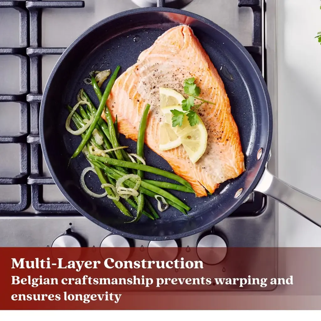 The Alva Maestro 11 Piece Cookware Set is your all-in-one solution for diverse cooking needs, including frying pans, saucepans, and stockpots. Its ceramic nonstick surface ensures easy cooking and cleanup, using less oil for healthier meals. Crafted from premium materials, this durable set delivers consistent performance. Heat-locking lids trap moisture and enhance flavor, while the straight-sided design offers 20% more cooking space for larger portions and complex dishes.