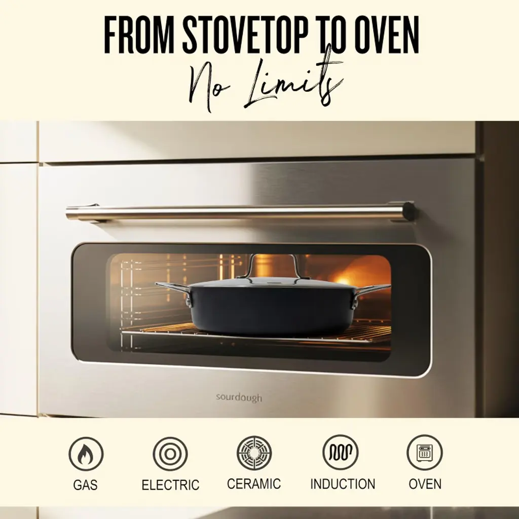 The Alva Maestro 3 Piece Ceramic Nonstick Frying Pan and Saute Pan set offers maximized cooking space with straight-sided designs, perfect for larger meals. The nonstick ceramic coating ensures effortless food release and quick cleanup, while the thick aluminum base guarantees even heat distribution. With a secure stainless steel handle for safe handling, this set is easy to care for—just use low to medium heat and hand wash gently to maintain its durability.