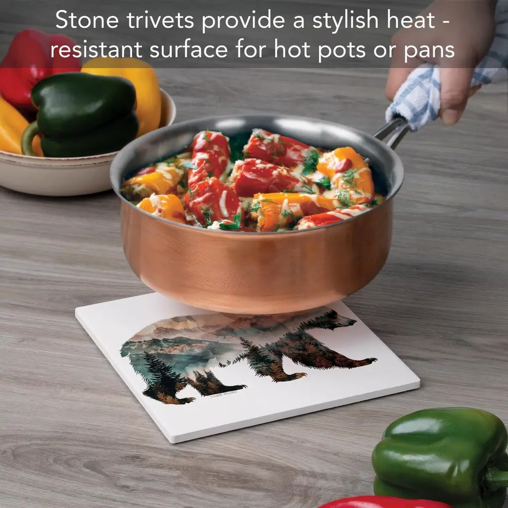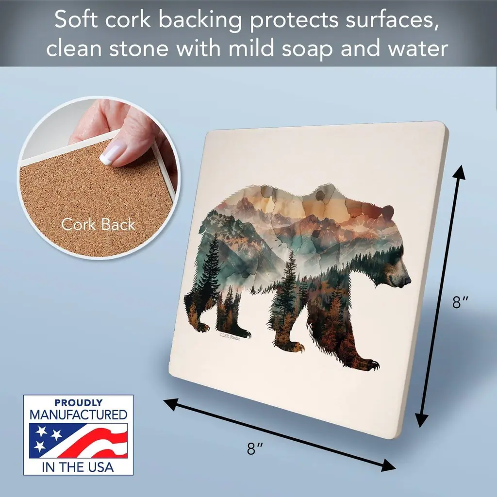 Bear Silhouette Decorative Heat Tolerant Stone Trivet With Non-Skid Cork Backing 8” Square Artistic, Durable, Easily Wipes Clean - Multi